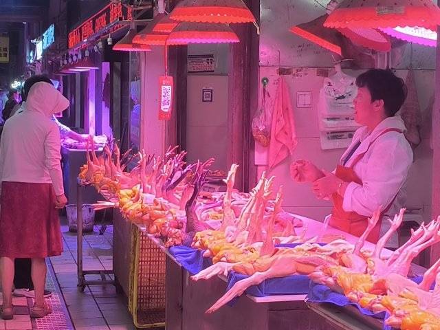 一进五里多,热闹的叫卖声立马包围了耳朵。那边是“咚咚咚”的剁肉声,紫色灯光下厚实肉块闪着油光,老板娘一边剔下肥肉一边招呼客人;这边是“轰隆隆”的钢磨打粉声,特产店的天麻和西洋参被磨成细粉,传来一股厚重的药材香气。摊贩扯着嗓子叫卖,“菠菜5块钱一公斤”,他一边扒拉着菜一边算钱,走近一看,摊位上的蔬菜青翠又新鲜。