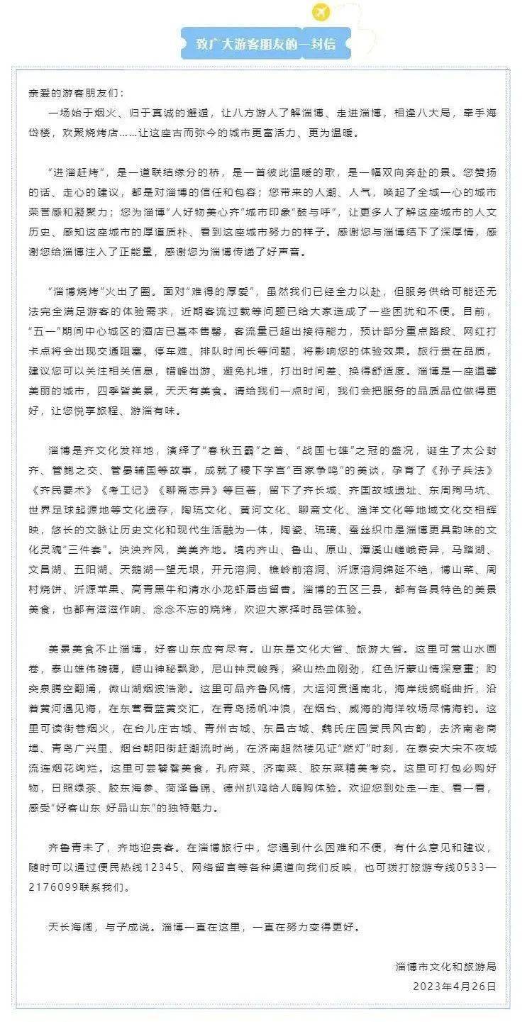 4月26日, 淄博市文化和旅游局发布《致广大游客朋友的一封信》。