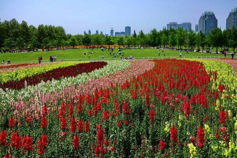 七彩花田占地面积约2万平方米,种植了观赏期较长的金鱼草和大花飞燕草,通过分色栽种,形成大色块的花海组合。黄色、绿色、红色、粉色、蓝色、紫色等各色交织在一起,让人感受到来自大自然的瑰丽风采。