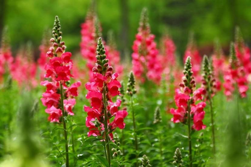 金鱼草叶片呈长圆状披针形,花冠呈筒状唇形,基部膨大呈现囊状结构,形成一串一串的造型感,花骨朵前端如同鱼嘴,围绕着它有一圈斑点,犹如金鱼的眼睛和嘴巴,栩栩如生。两侧若隐若现一条窄窄的凹槽,就像金鱼身体的侧线。一阵风吹过,仿佛成千上万条金鱼在花海中自由游动,翩跹起舞。