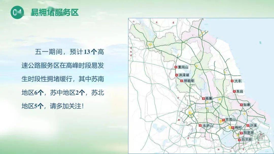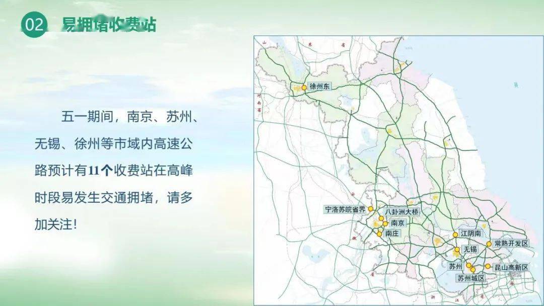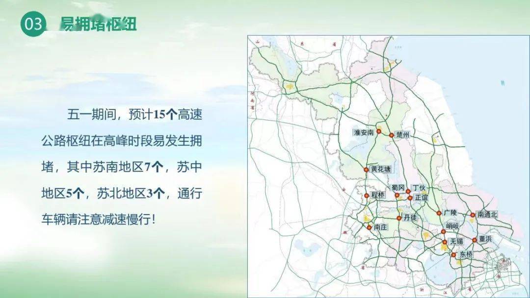 值得注意的是,“五一”期间部分路段交通拥堵集中。江苏省公安厅交警总队副总队长赵广义表示,京沪高速公路泰州至苏州段,沈海高速公路南通、苏州段,常台高速公路苏州段,长深高速公路淮安段,新扬高速公路宿迁至扬州段等11个路段,南京八卦洲大桥、江阴大桥、苏通大桥等过江通道,高峰时段将会出现车多缓行甚至短暂交通拥堵现象。部分高速公路服务区停车资源不足,在就餐时段和货车集中等待错峰放行时段,可能出现车辆“溢出”影响主线通行情况。南京、苏州、无锡、扬州等旅游热门城市,高峰时段进出通道可能发生交通拥堵,景区周边道路可能出现车辆积压。