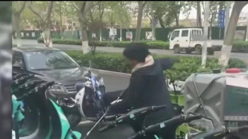 共享单车被阿姨用高压水枪清洗得干干净净的。