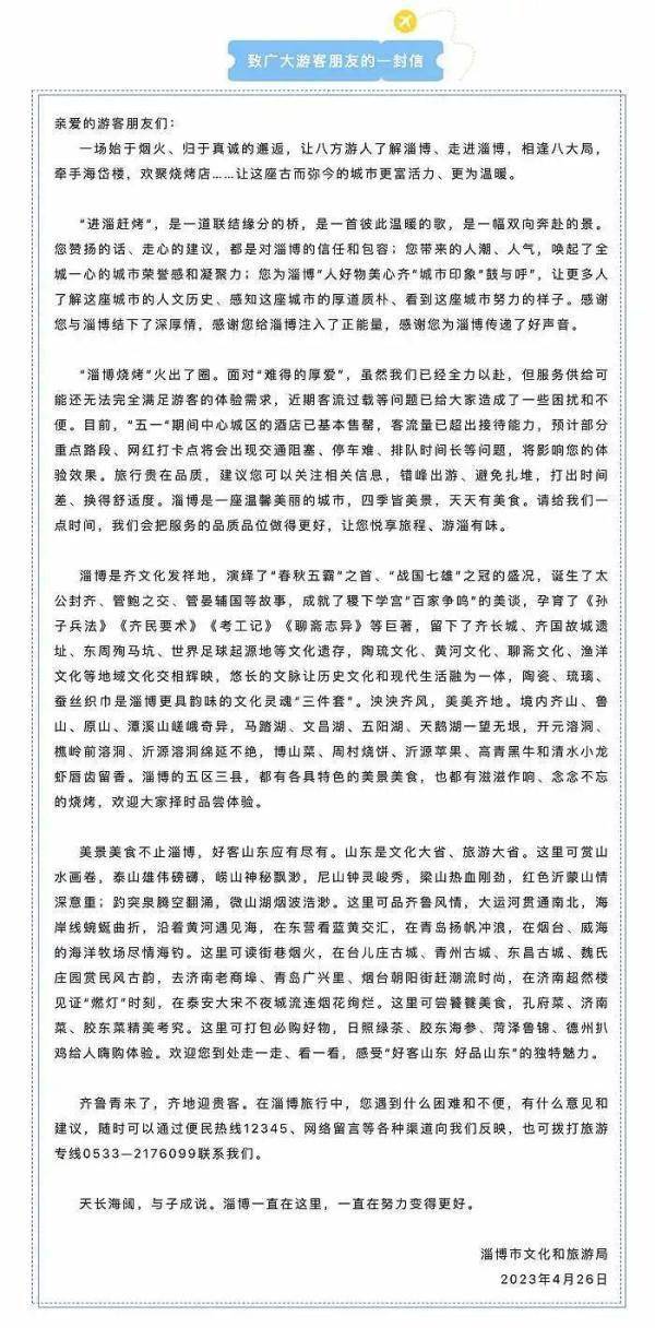 信中提到:“淄博烧烤”火出了圈。面对“难得的厚爱”,虽然我们已经全力以赴,但服务供给可能还无法完全满足游客的体验需求,近期客流过载等问题已给大家造成了一些困扰和不便。目前,“五一”期间中心城区的酒店已基本售罄,客流量已超出接待能力,预计部分重点路段、网红打卡点将会出现交通阻塞、停车难、排队时间长等问题,将影响您的体验效果。旅行贵在品质,建议您可以关注相关信息,错峰出游、避免扎堆,打出时间差、换得舒适度。请给我们一点时间,我们会把服务的品质品位做得更好,让您悦享旅程、游淄有味。
