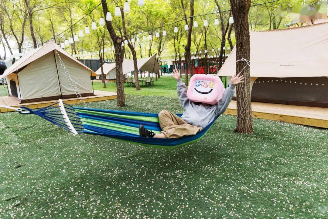 进门顺着路一直走,就能看到露营区。林间,绿地上安札着帐篷、天幕,瞬间就有了“诗与远方”的氛围。帐篷里配有充气沙发、床品、小桌等必要设施。旁边还有吊床,躺在上面,“忽悠儿、忽悠儿”的摇着,想想都觉得美。