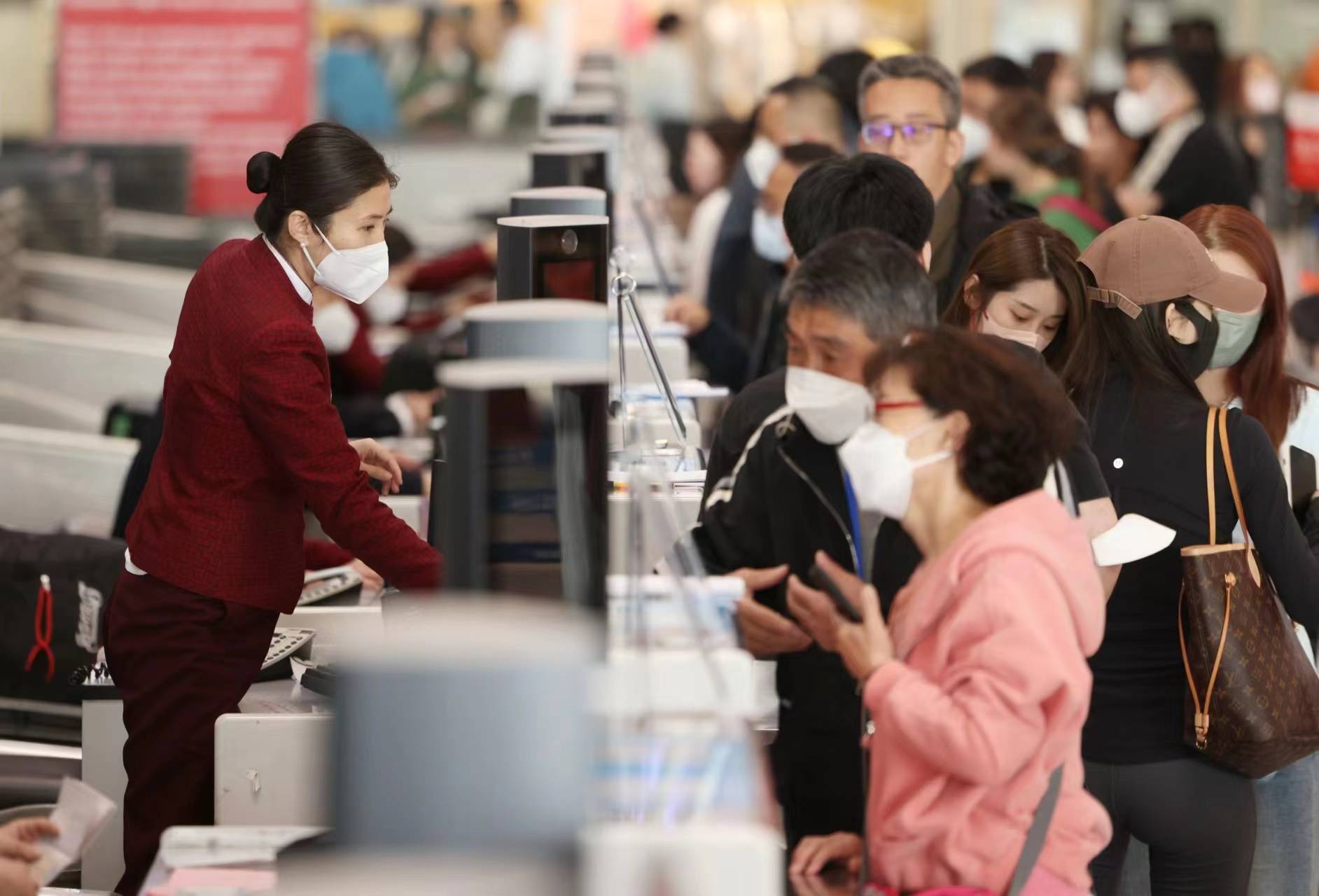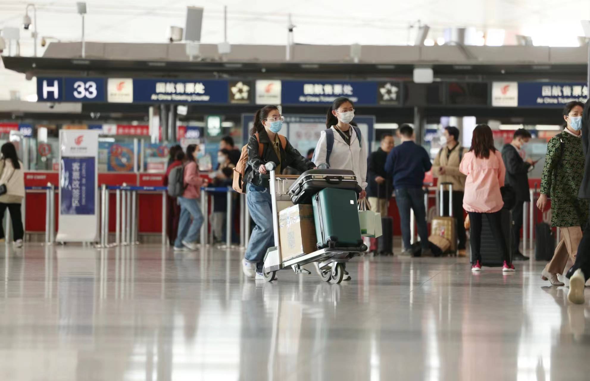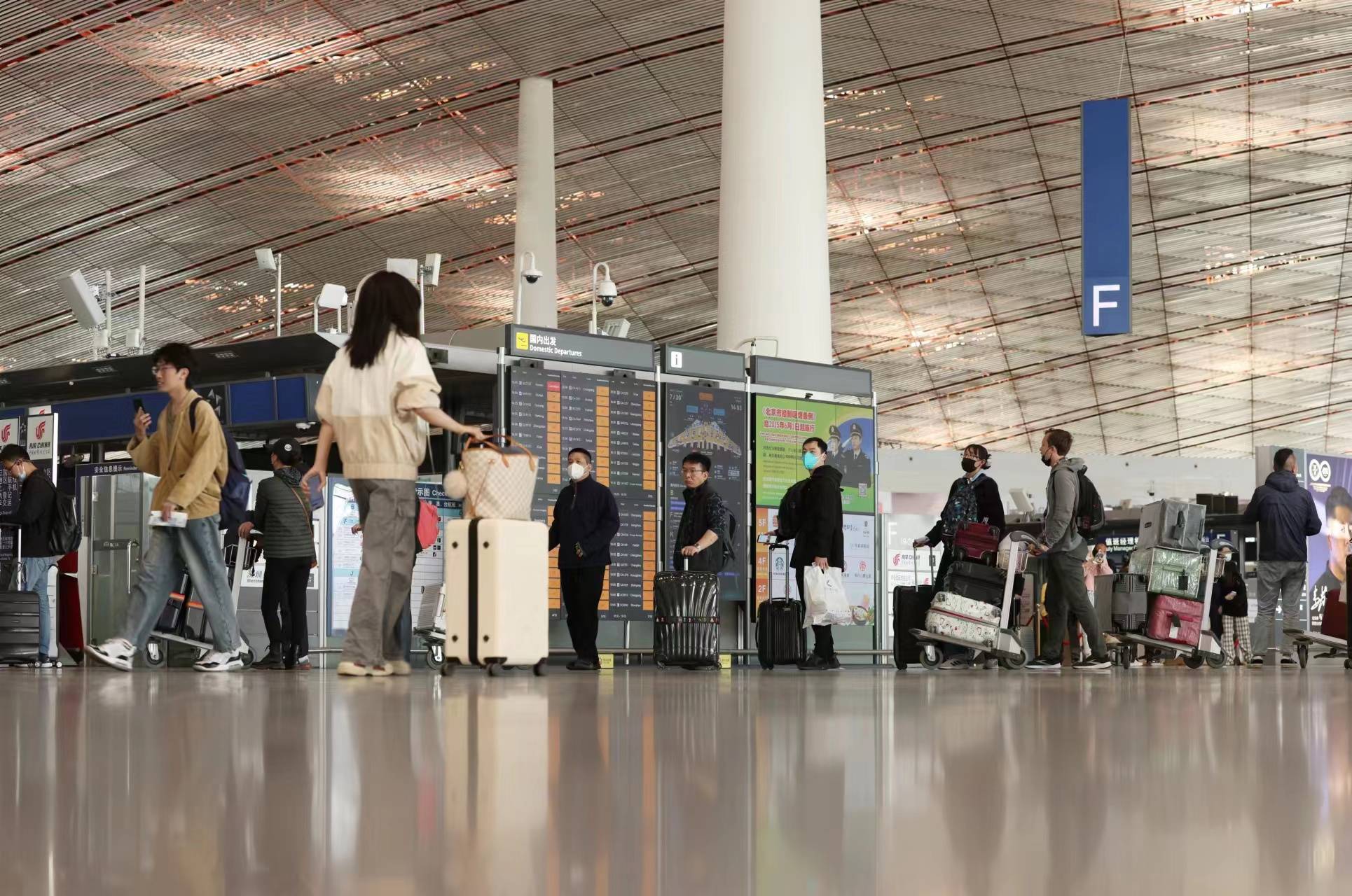 4月26日下午2点左右,首都机场3号航站楼内,旅客宋小姐和朋友在国航柜台前办理值机手续,她们趁着“五一”假期去迪拜旅游。“现在国际航线恢复了很多,而且回国也非常方便,所以我们提前购买了机票,准备‘五一’假期好好放松一下。”宋小姐表示。航站楼内举家出游的旅客不少,除了出境游,选择国内游的旅客也很多。郭先生一家“五一”假期去成都度假,郭先生说:“孩子很喜欢大熊猫,趁着放假带他们去四川看看大熊猫。”