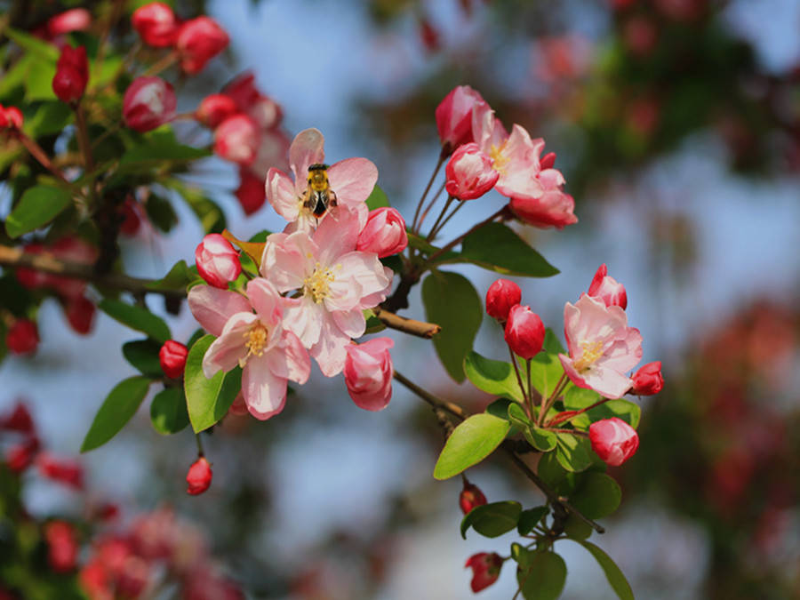 淮善园的海棠花盛开了。左侧的步道两边蜿蜒地排列着株株海棠,热烈奔放,鲜艳夺目,远远望去像一团燃烧的烈焰,走近细瞧是一片粉色的海洋。每一棵海棠树就是一眼喷花的飞泉,给春天增添了无限的生机;每一朵海棠花就是一颗美丽的心灵,为淮善园注入了慈善的能量;每一片海棠花瓣就是一份浓浓的乡情,给周总理送上故乡人民永久的思念。