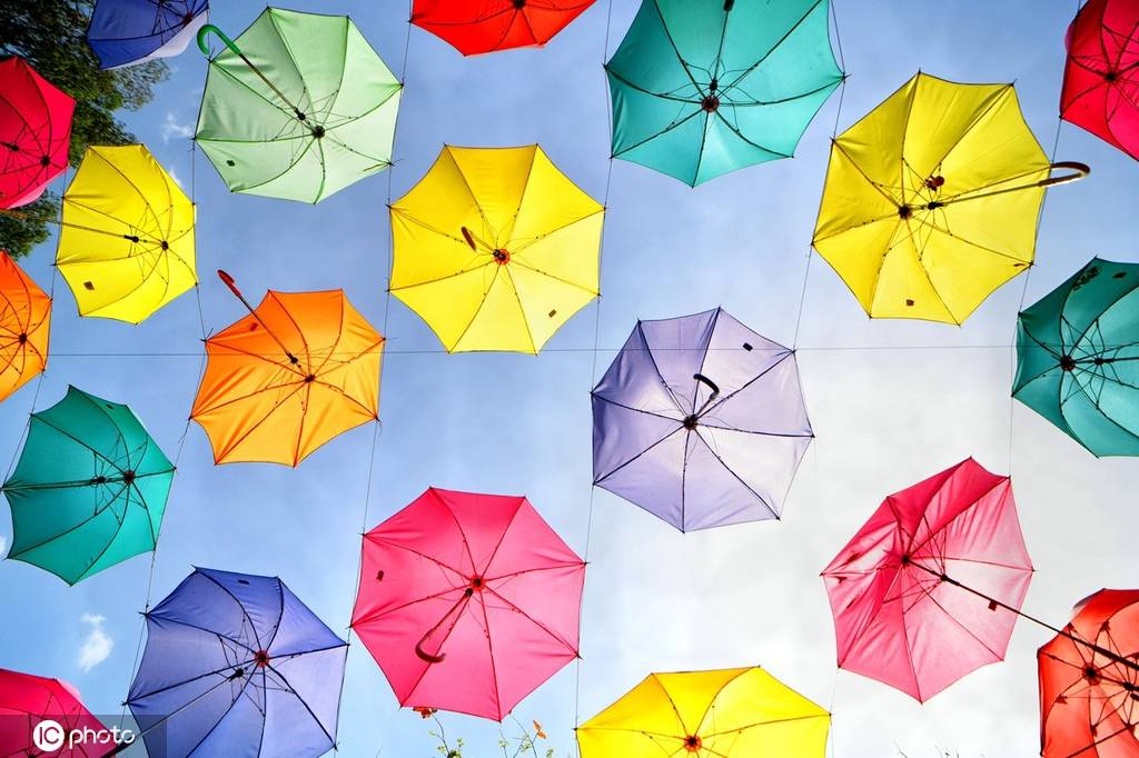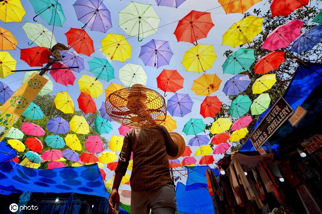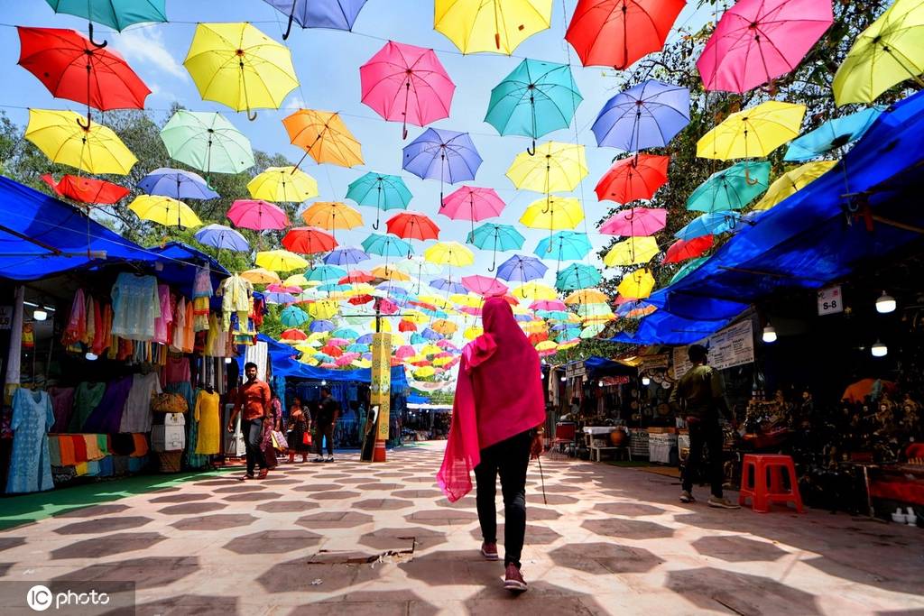 印度新德里,民众在Dilli Hats市场的五彩伞下行走。