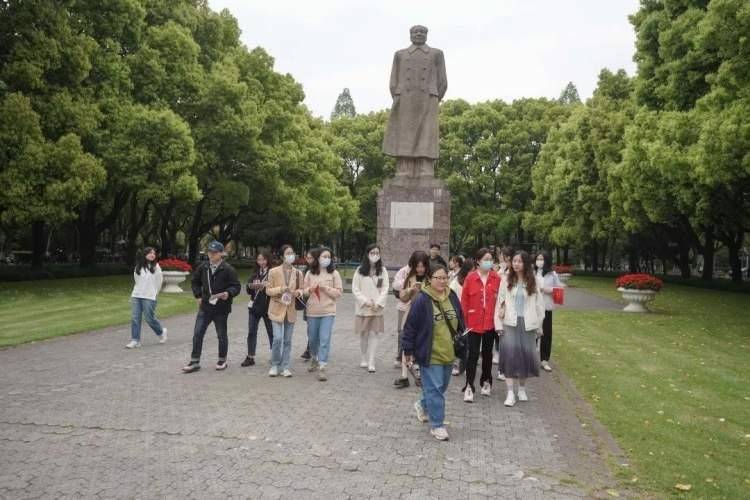 穿过“睦邻门”,踏过国定路桥,主题研学线路的第二部分正式开启。在复旦大学,青年们用脚步丈量红色地标,用心领略红色基因。宣言广场、毛主席雕像、相辉堂、烈士纪念广场......一座座建筑、一段段往事,无一不在诉说复旦与祖国同呼吸共命运的发展历程。青年们认真聆听、驻足观看,徜徉在高等学府的文化底蕴中。