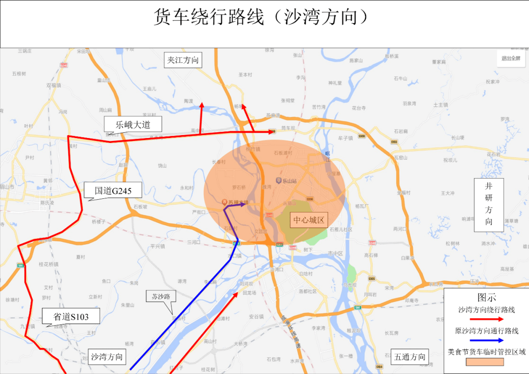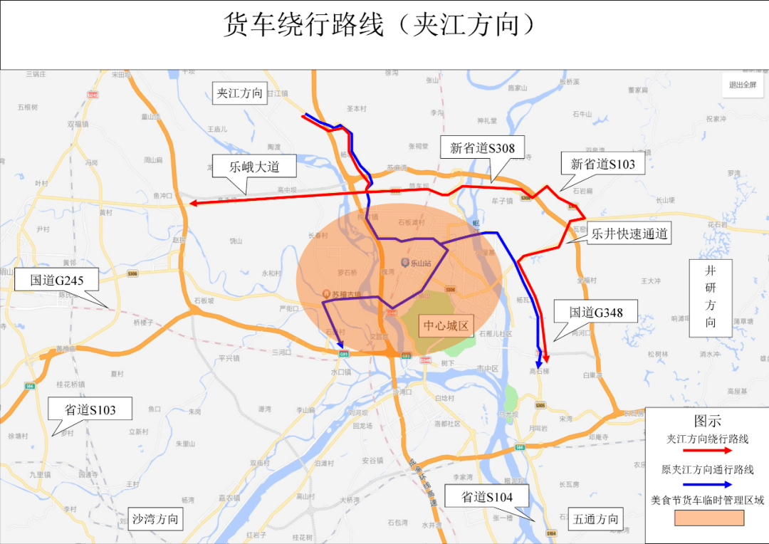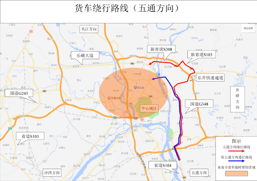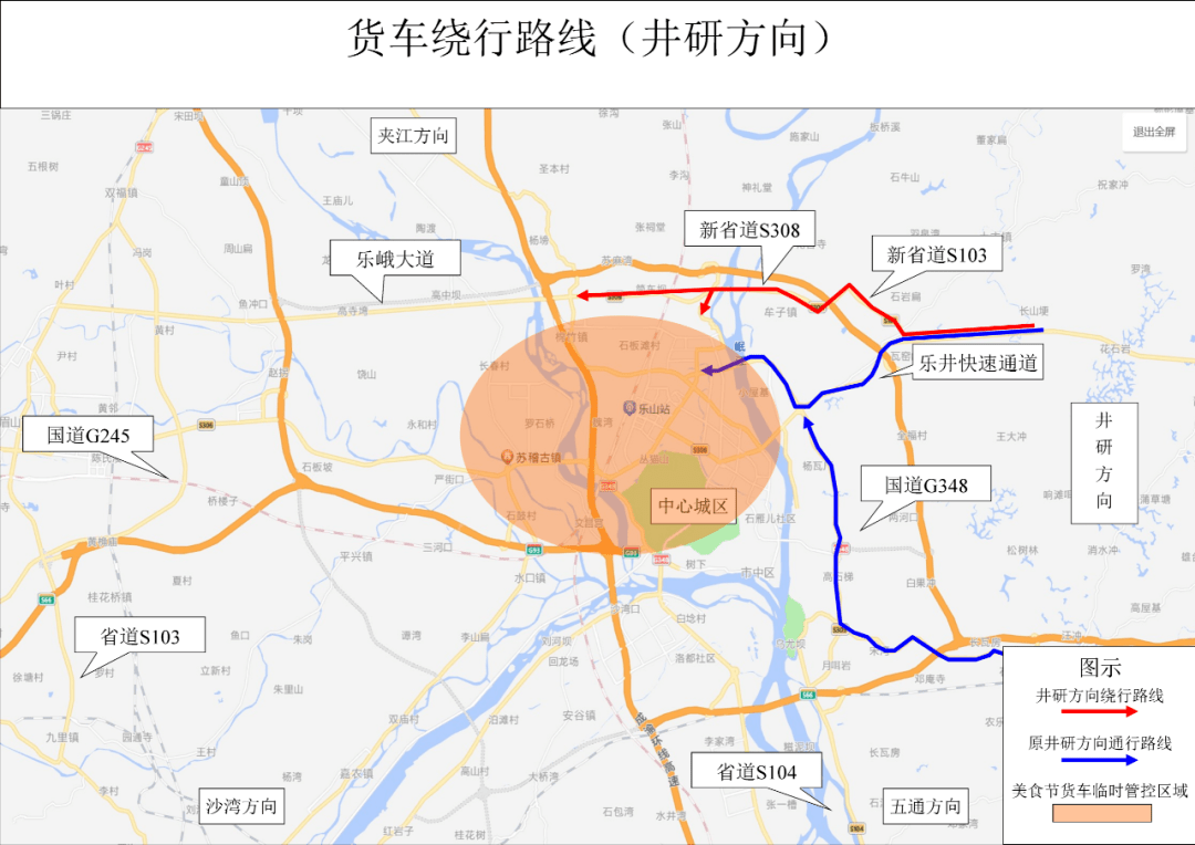 往市中区方向:从乐井快速通道(市中区方向),经新省道S103线、新省道S308线、岷江四号桥、乐峨大道绕行。