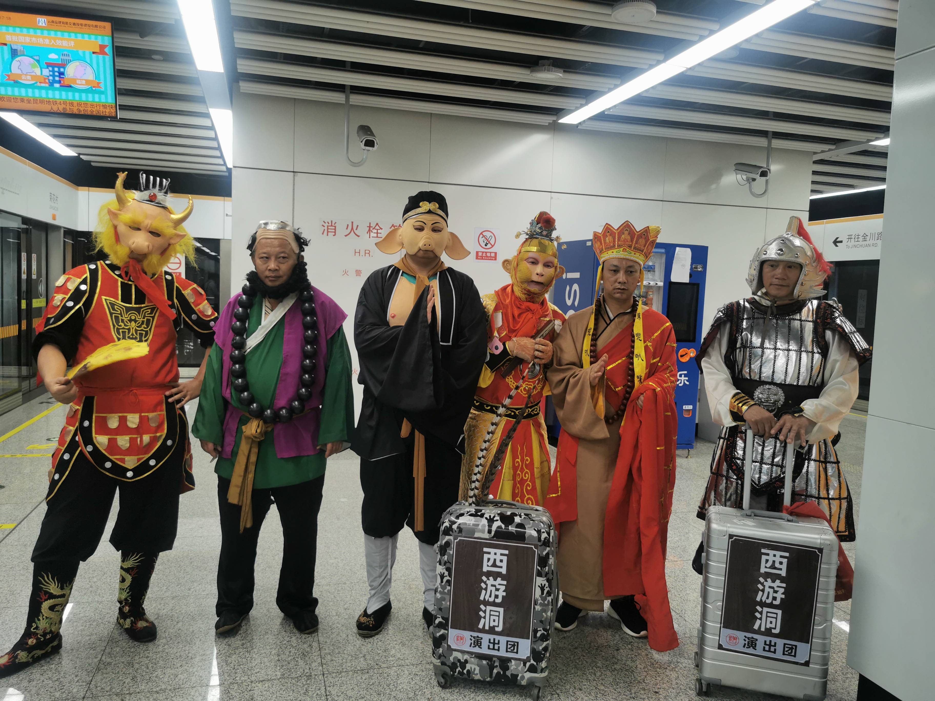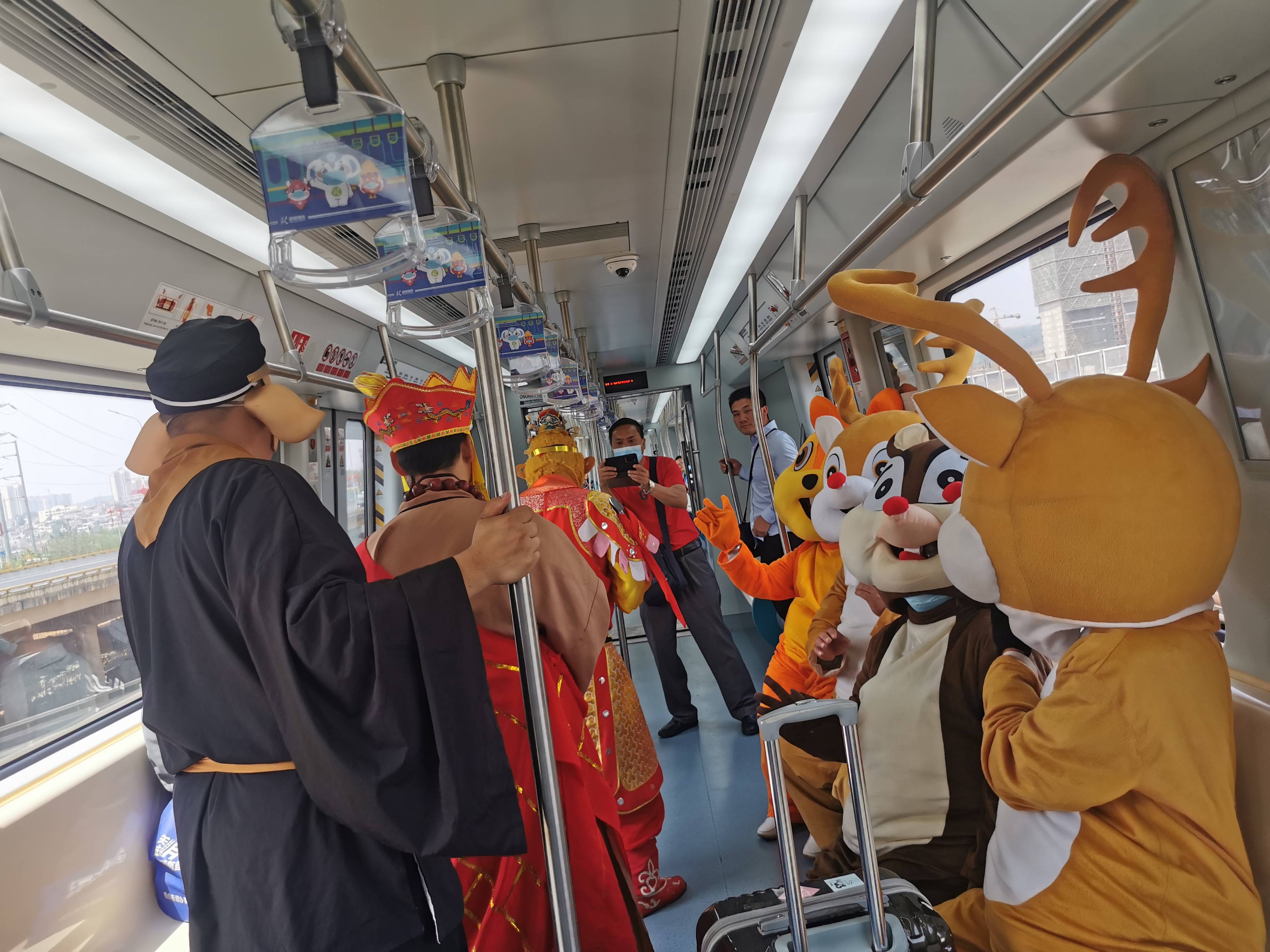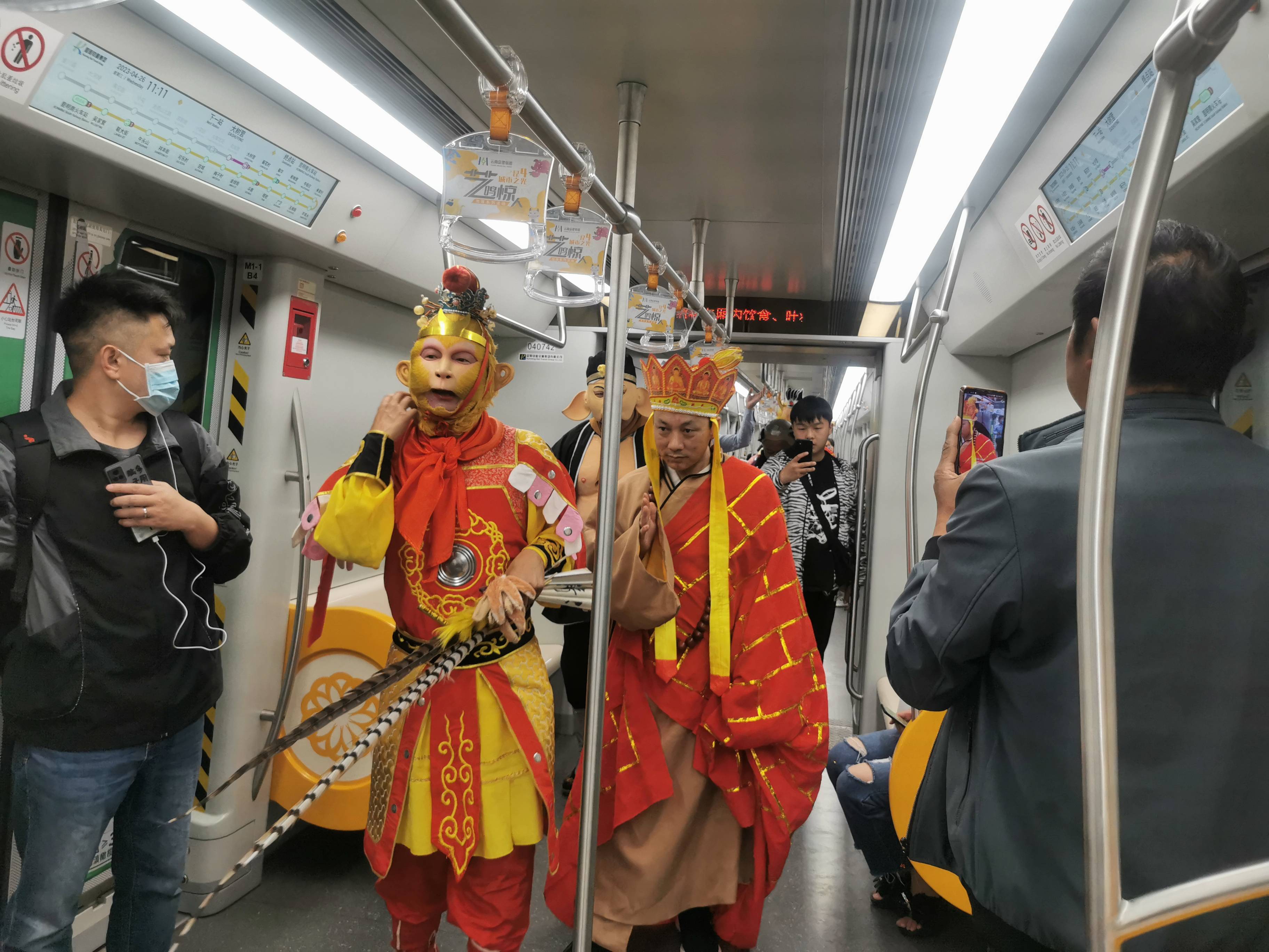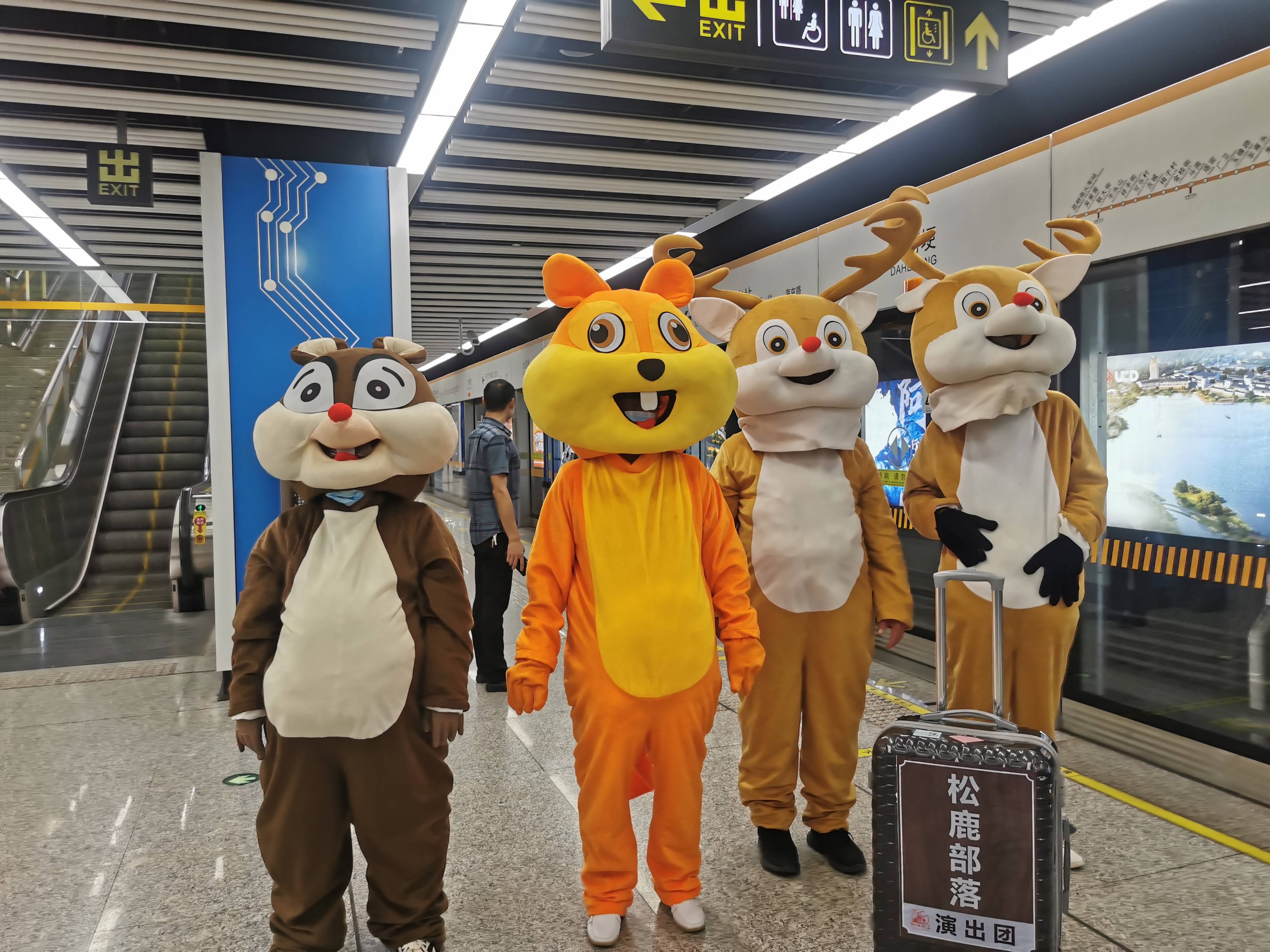 4月26日,云南西游洞集团公司旗下的西游洞风景区和昆明松鹿部落景区工作人员穿上工作服,走进了昆明地铁,和昆明市民来了一场亲密互动,引发市民围观、拍照。