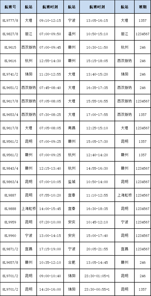 此外,祥鹏航空已开通的独飞航线还包括昆明=盐城、昆明=安庆、昆明=绵阳、丽江=温州、昆明=宜春=上海、安庆=宁波、宜昌=宁波等。