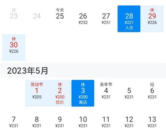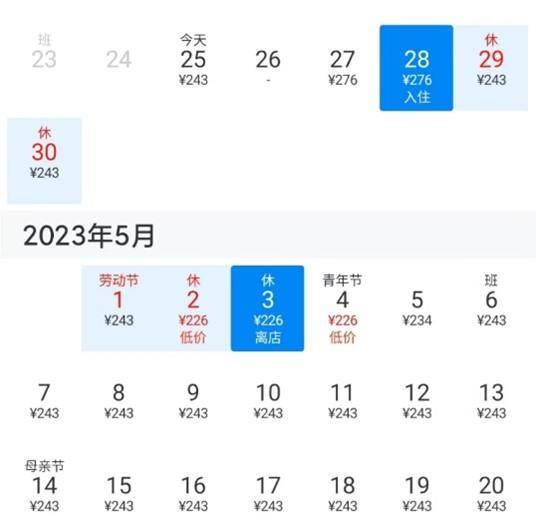 4月25日、26日,红星新闻记者多次检索发现,井冈山逸丰大酒店在5月2日-5月4日的入住定价为226元,而节前节后的价格多为243元或276元,高于“五一”假期的入住价格。同样存在这种情况的还有井冈山江轩宾馆、辽宁鞍山的莱斯顿精品等。