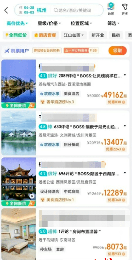社交媒体上传播的两张截图显示,“五一”期间,杭州有酒店价格预定价格显示为6万元和4万9千余元,引发有关“五一”期间酒店涨价的热议。红星新闻记者注意到截图中是在“高价优先”的搜索条件下显示了两个酒店的6万元和近5万元预定价格。