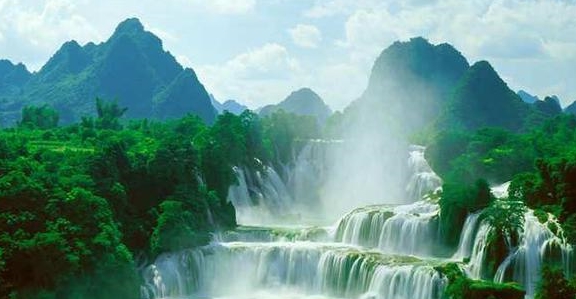 也是世界第二大跨国瀑布。位于大新县硕龙镇德天村与越南接壤的归春河中,中越边界线上,瀑布大部分在中国一方,小部分属越南。归春河为中越两国界河,河水被雄踞河中的浦汤岛阻流,从岛两边夺路激石,汇集成30多道大小长短不一的湍流扑下断崖,从不同的角度形成三叠瀑布,宽120米,落差约70米,纵深约60米,流量50立方米每秒~60立方米每秒。崖壁下承接来水的龙潭面积约6000平方米,深6米~7米,可荡舟。瀑布顶部浦汤岛右侧约50米处,立有中越边界西路53号界碑。