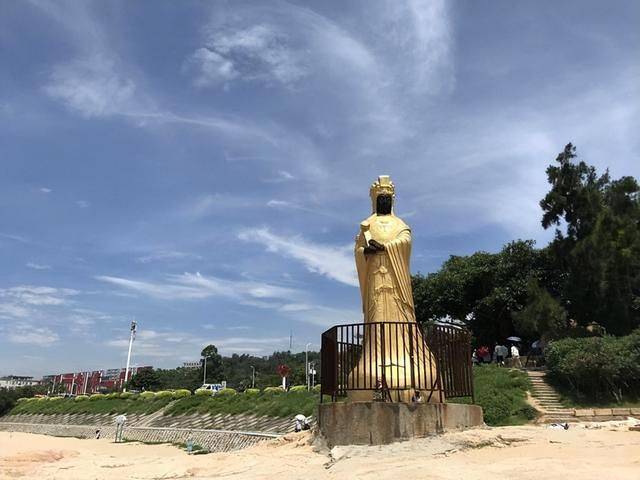 一国两制沙滩的规模不是很大,地处厦门岛的东海岸,与金门岛隔海相望,从北到南不到2公里的距离,海滩也不宽敞,目测不过几十米,伴随着潮涨潮落,还有变窄的可能,景观也不是很丰富,北边有妈祖像,南边是椰风寨,中间是一些简单的雕塑,除此之外,就是金光闪闪的沙滩,略显简单。