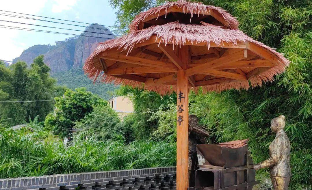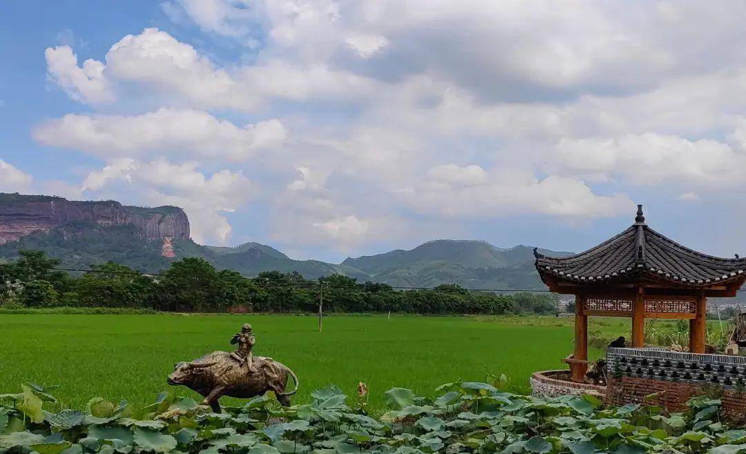丹霞送福山连山,铜石岭下炊烟忙……正如“丰村之歌”的歌词那样,丰村是典型的丹霞地貌。火热八月,成片的稻田一片葱茏,禾苗翠绿茁壮。在田田的荷叶与碧绿的稻苗连接处,一个吹着“笛子”的“牧童”坐在“牛背”上,旁边是一个古香古色的凉亭。凉亭下,采用雕塑的形式,还原了丰村幸福井这个百年老井的样子。坐在亭子内凭栏远眺,不远处树木整齐排列,像一列士兵守护着这一方田园美景。远处,群山绵延,高低起伏,让丰村画卷更添秀美。