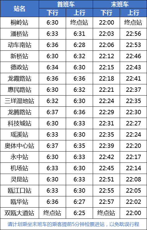 运营时间与周五运营调整时间一致,瓯华站及双瓯大道站开往桐岭方向的首班车于6:30前发出,其余各站首班车均在6:30-6:40间发出,开往桐岭站及双瓯大道站的末班车延长至22:00对向发出,各站末班车时间同步调整。