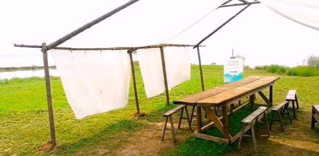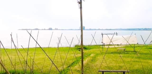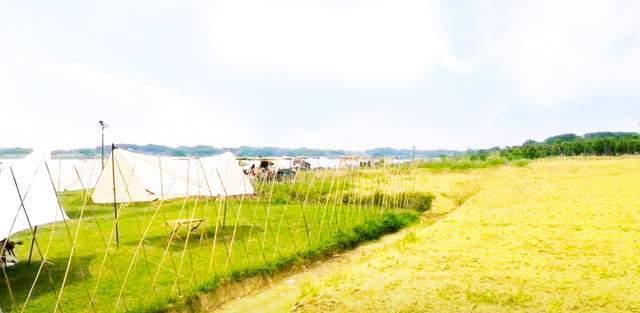 来到慢漫露营地入口,首先看到的便是密密麻麻的“围墙”。所谓围墙,严格来说并不算墙,它是由竹子围成的篱笆,绕行在湖边草坪和洼地之间,看着十分轻巧。露营地大门,有一块招牌,木制横梁构筑而成,充满原生态的风格。也就是说,在露营地上,看不到钢筋水泥等建筑材料,多是木制、无纺布和纯布料打造的休闲地。浅色系的装饰、淡泊的湖景、浅浅的天空,湖光水色掩映在一起,那种飘渺轻快的氛围十分感染人。