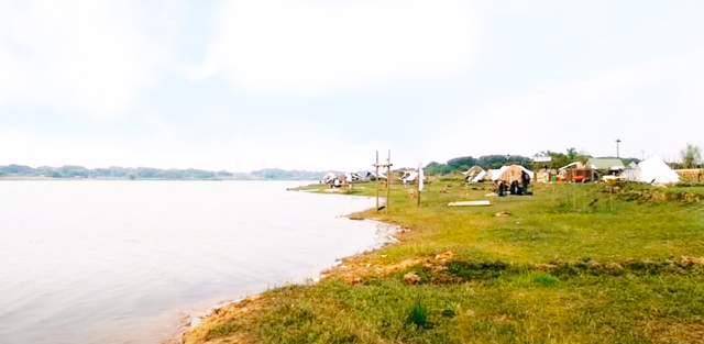 相对于小朋友们很快沉浸在各自的玩具里,大人们玩耍的项目要更有深度。一人一帐篷一间遮阳伞,还有桌椅配套,美食配套,于是总能看到各类文艺青年,玩音乐的,带着自己的吉他,坐在湖边,对着空旷的草坪和一望无际的水面,在夕阳光照里弹奏着浪漫的曲子,似乎爱情很快能不期而遇。也有玩绘画的,坐在帐篷前,架着画板,画纸上慢慢勾勒出东西两边遥远的树林和寥寥的民房,还有湖景天空,渐变的金黄色,让人心驰神往。