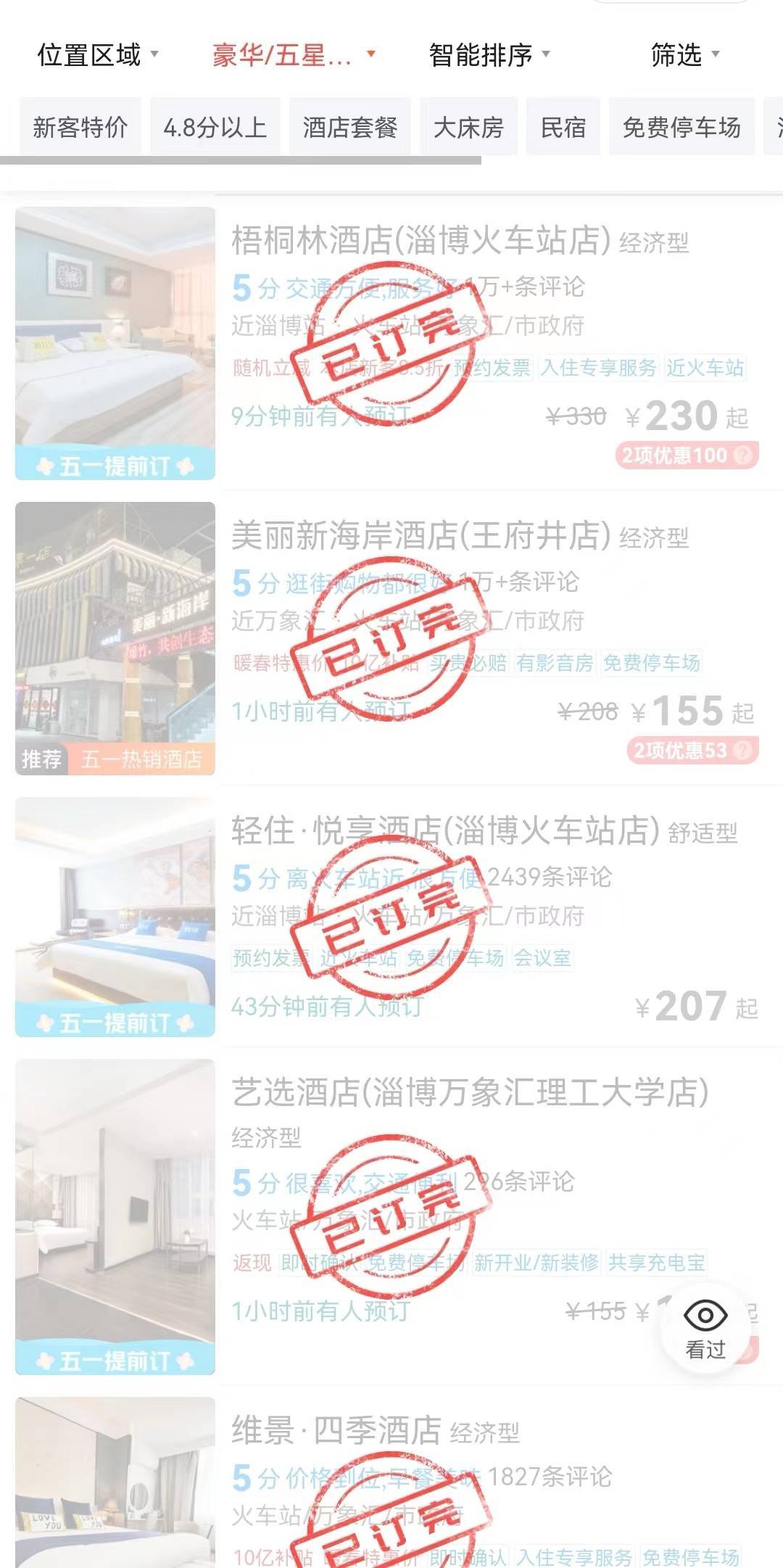 在某平台上搜索淄博的酒店,“五一”假期期间,满屏都是“已订完”。
