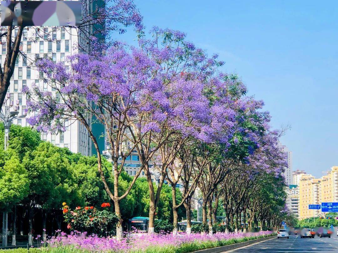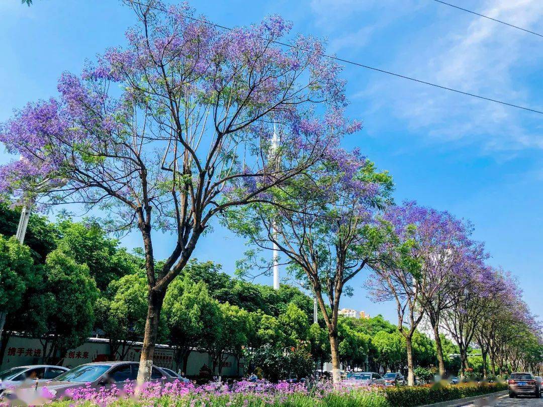 花已开,景正美,来教场路赴一场蓝花楹之约,淋一场蓝紫色花雨,感受“春城花都”的无穷魅力。