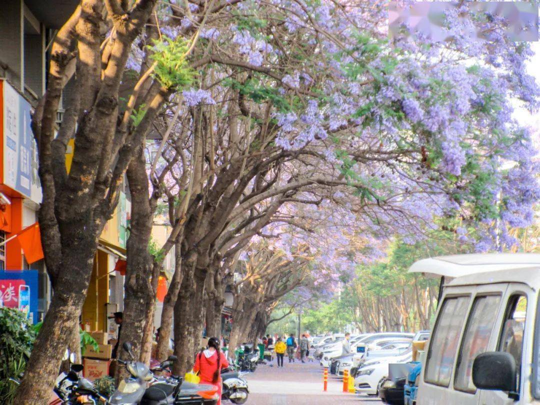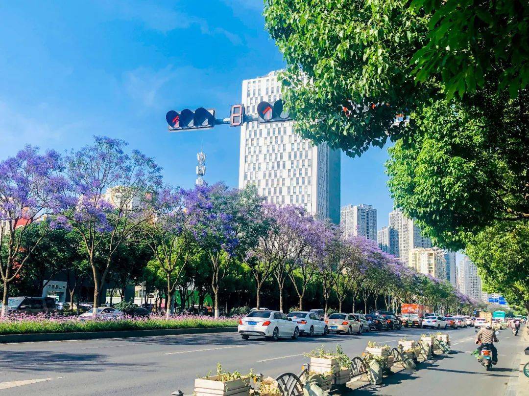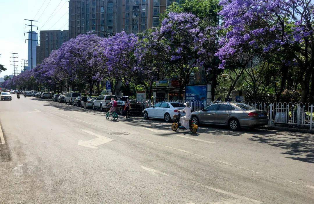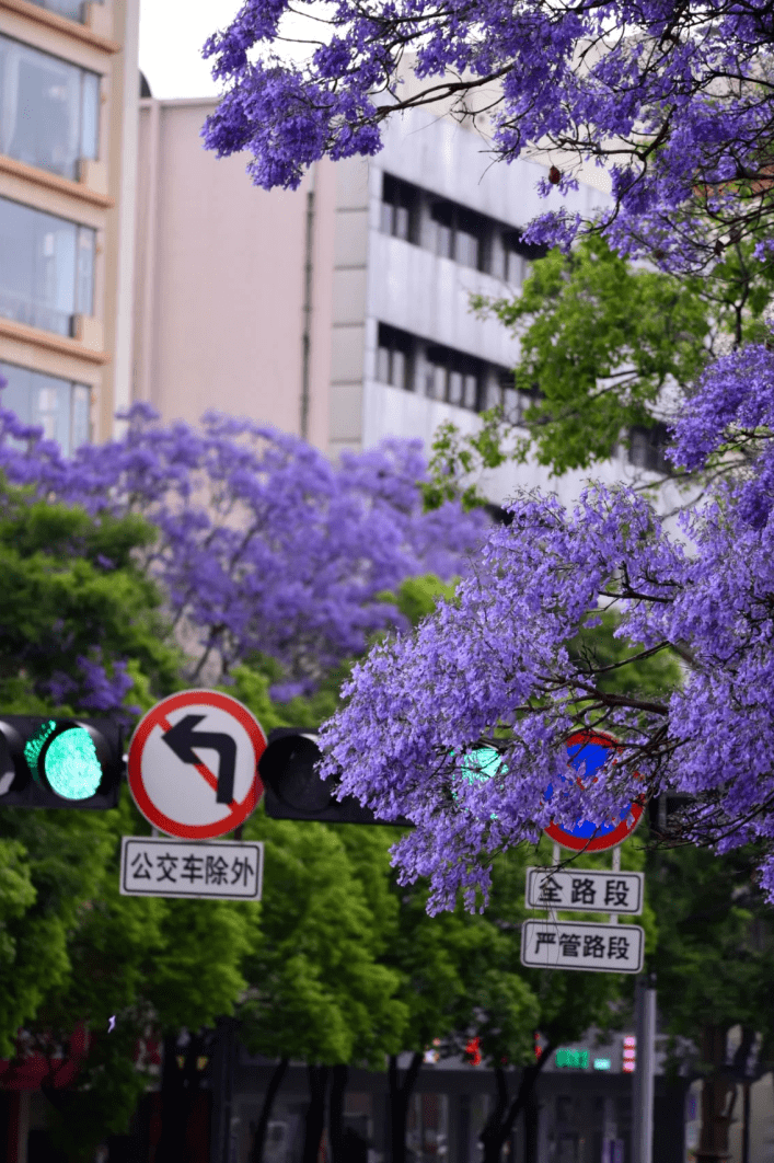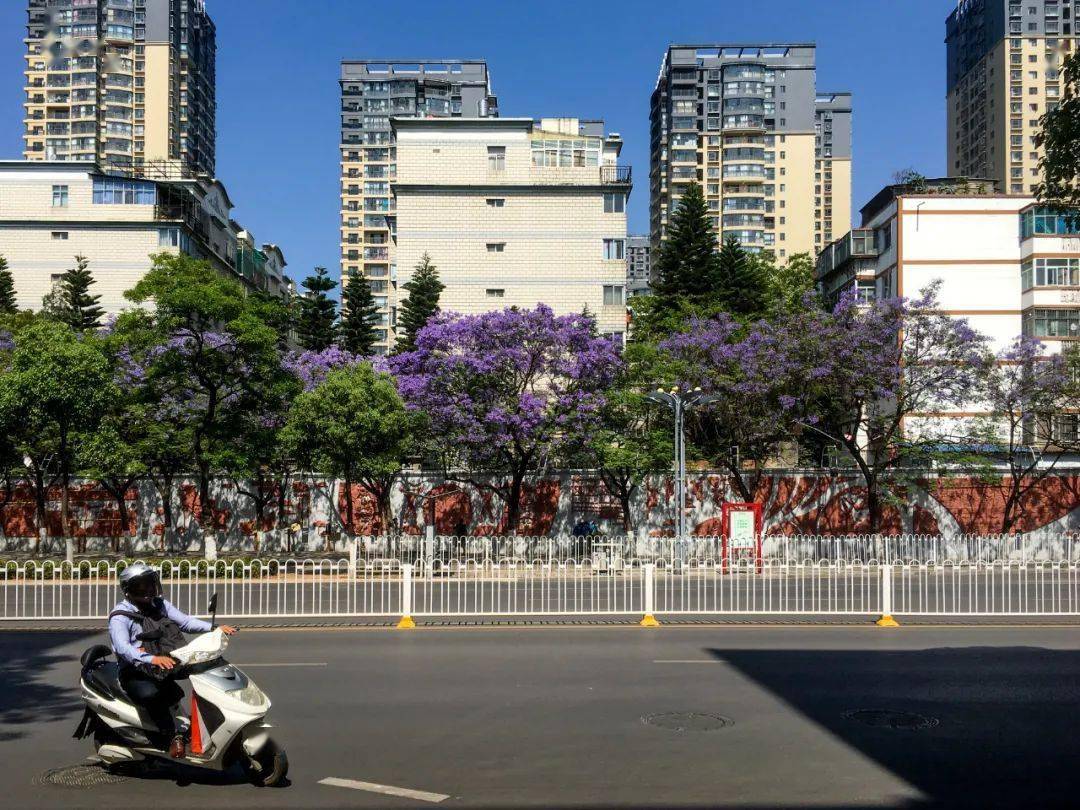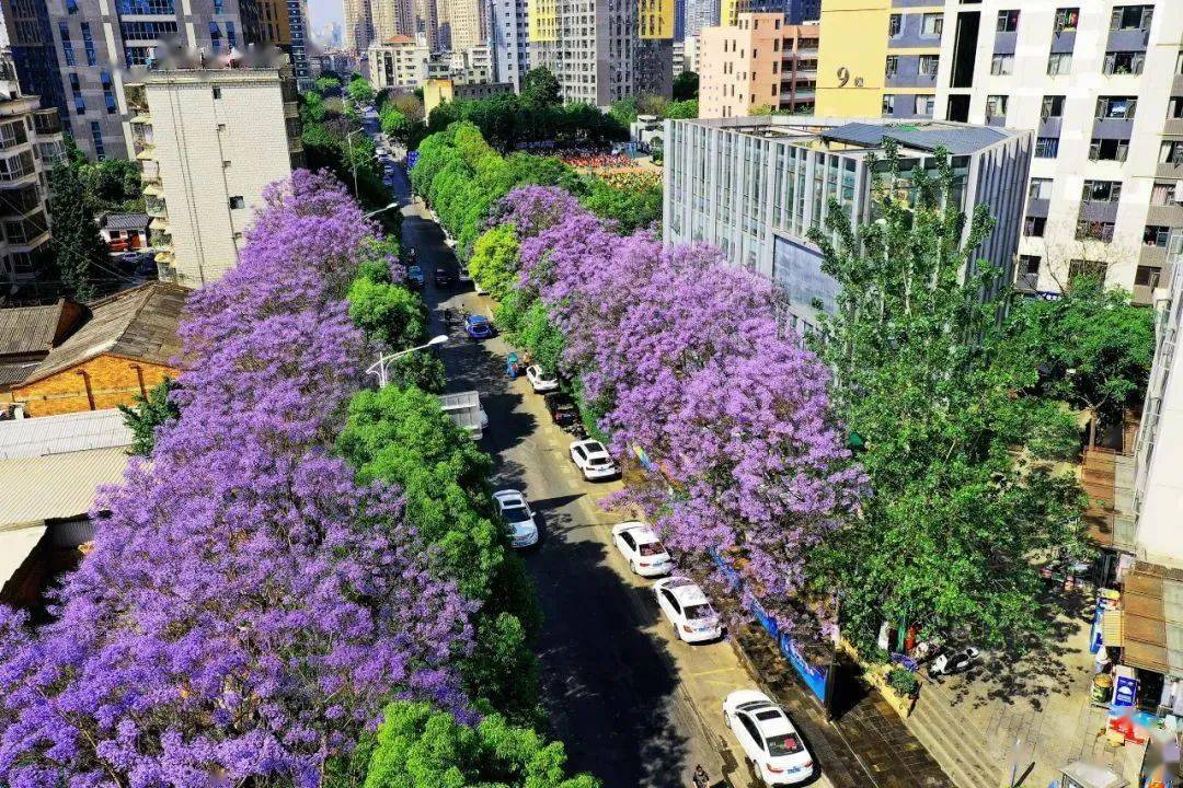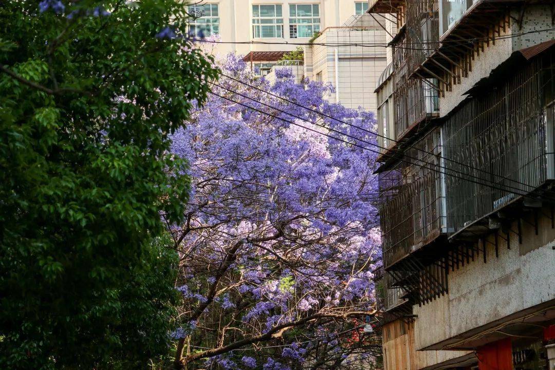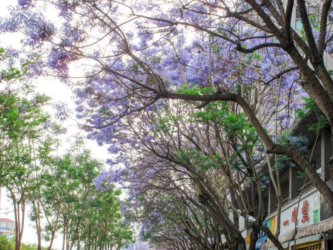 每年四、五月份,昆明街头的蓝花楹已迎来盛花期,一年一度的紫色浪漫即将上演。