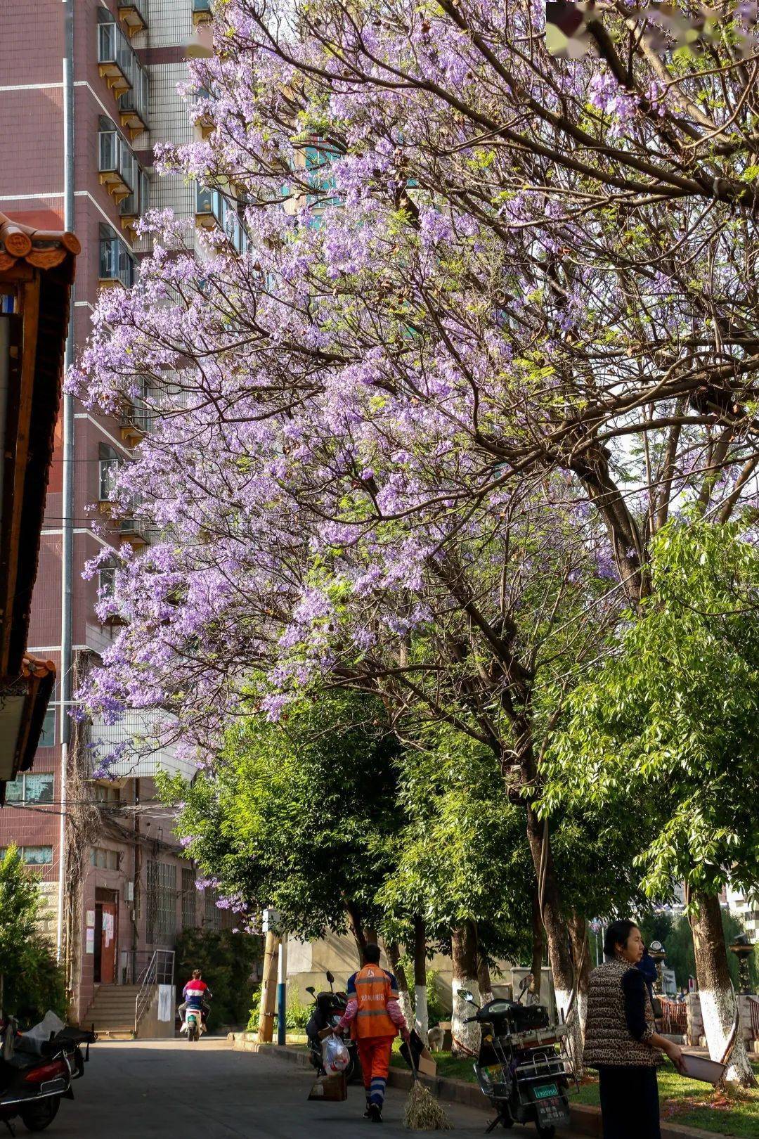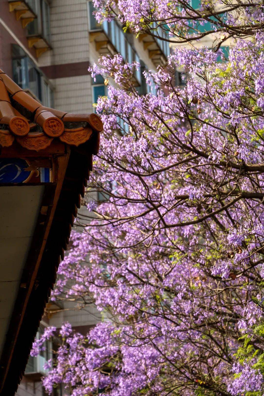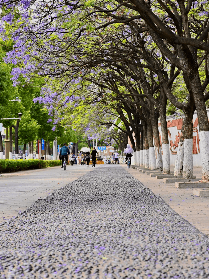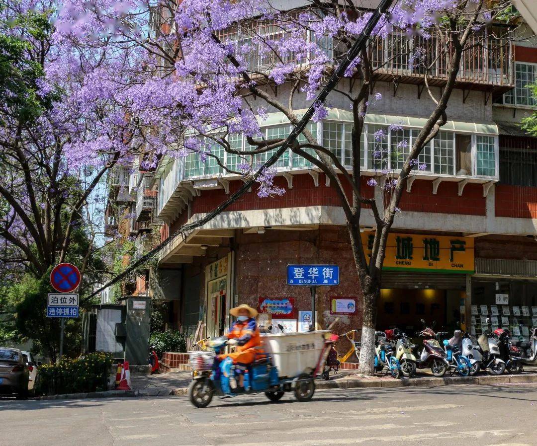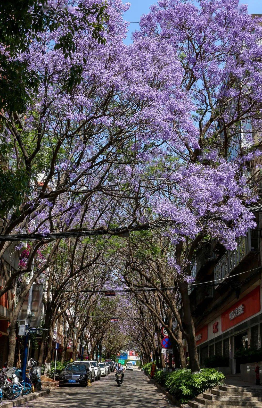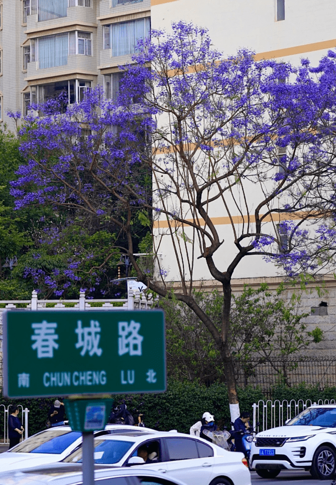 每年四、五月份,昆明街头的蓝花楹已迎来盛花期,一年一度的紫色浪漫即将上演。