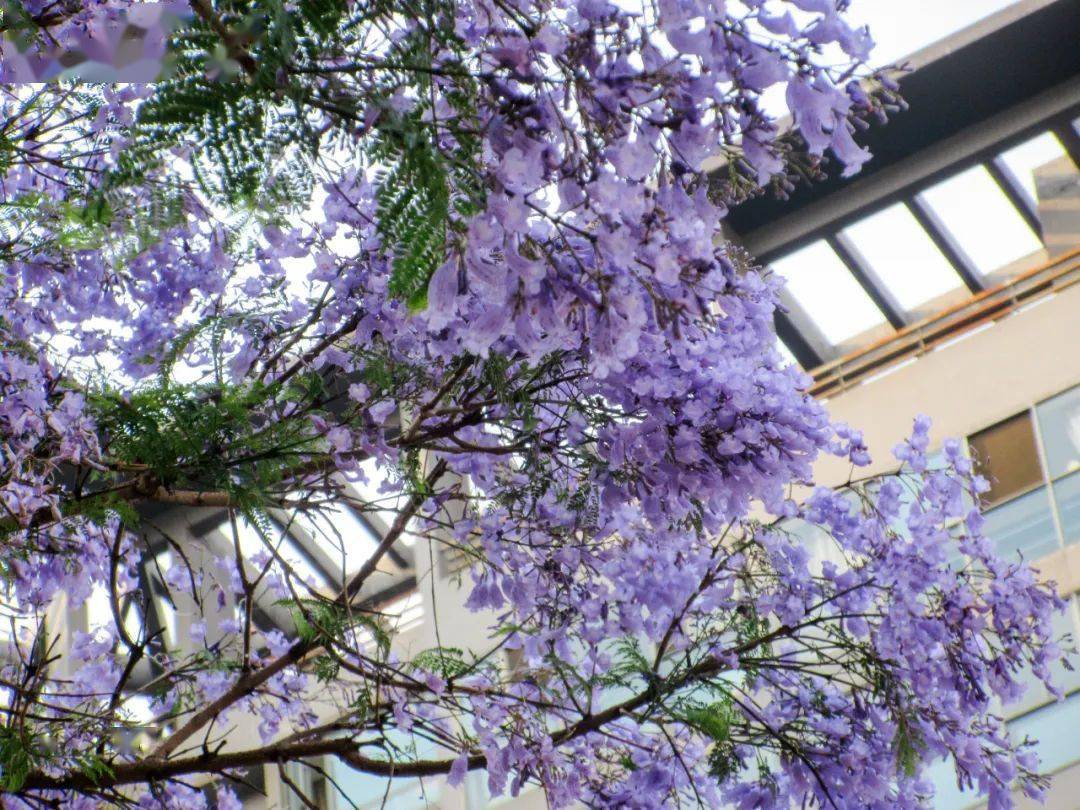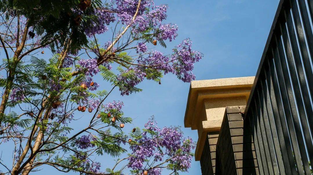 现在蓝花楹开的正好,一朵朵蓝花楹在枝头摇曳,一阵风过来, 简直就是一阵蓝花楹雨。