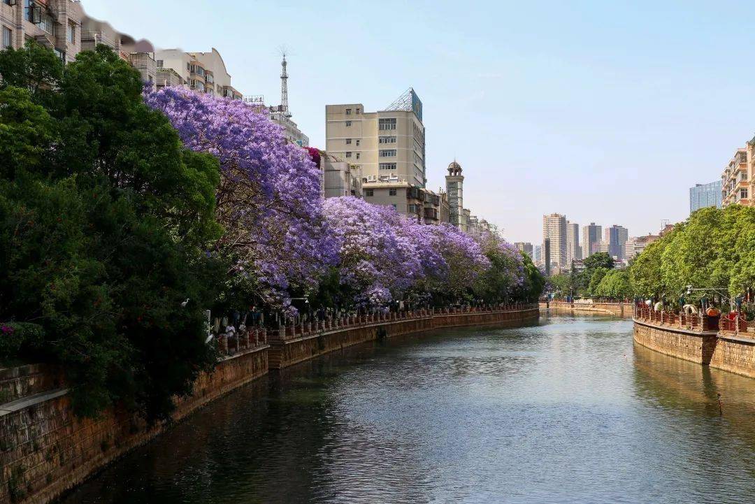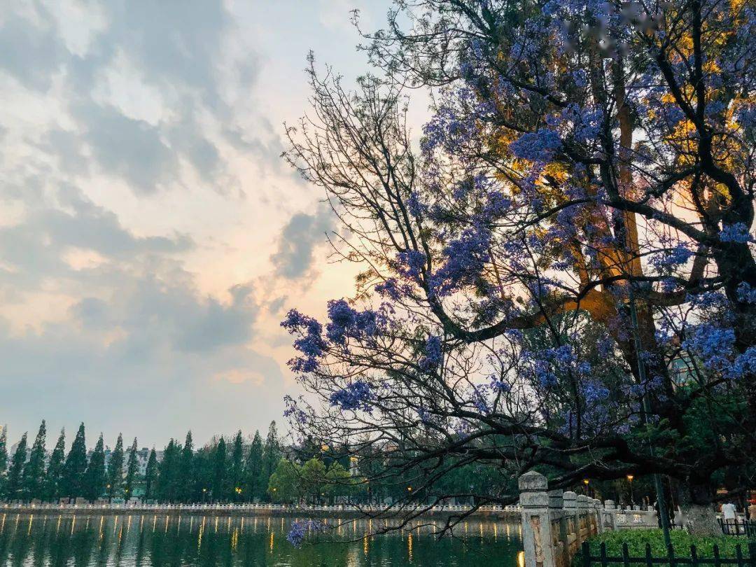 除了教场中路、春城路, 最火的蓝花楹拍照地,非盘龙江莫属,延伸至整个江面的紫色花朵,有水,有树相衬。