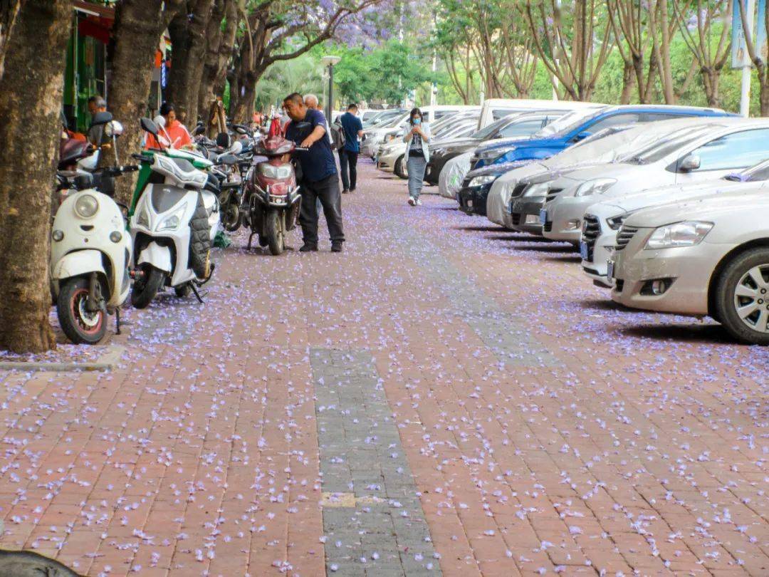 车来车往,道路上的蓝花楹也变的热闹起来,微风吹过的时候,花枝摇曳,花瓣洒落, 空气都弥漫着温柔的味道。