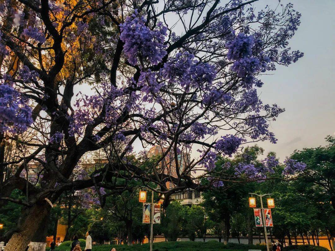 傍晚的蓝花楹别有一番韵味,大簇大 簇的花朵挂着枝头,霞光照射,还有树上亮着的小灯,每一样都成为了美景不可缺少的存在。