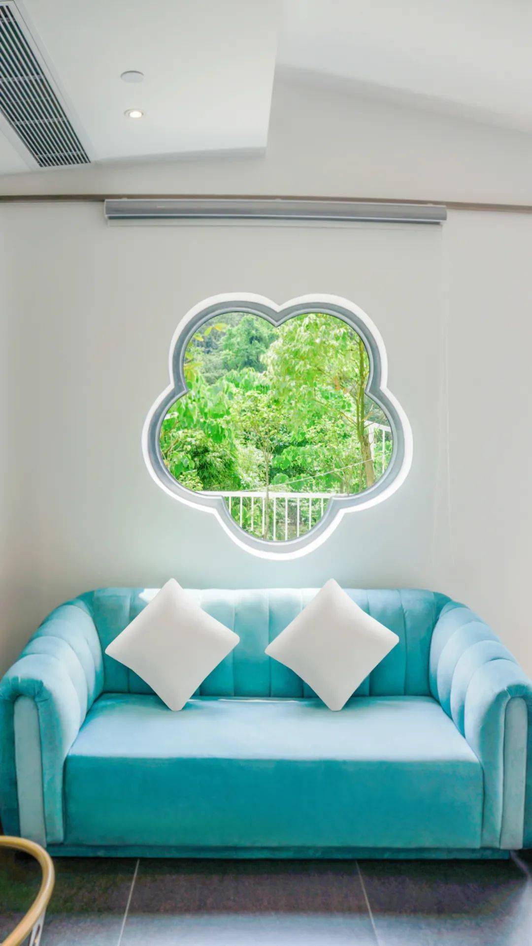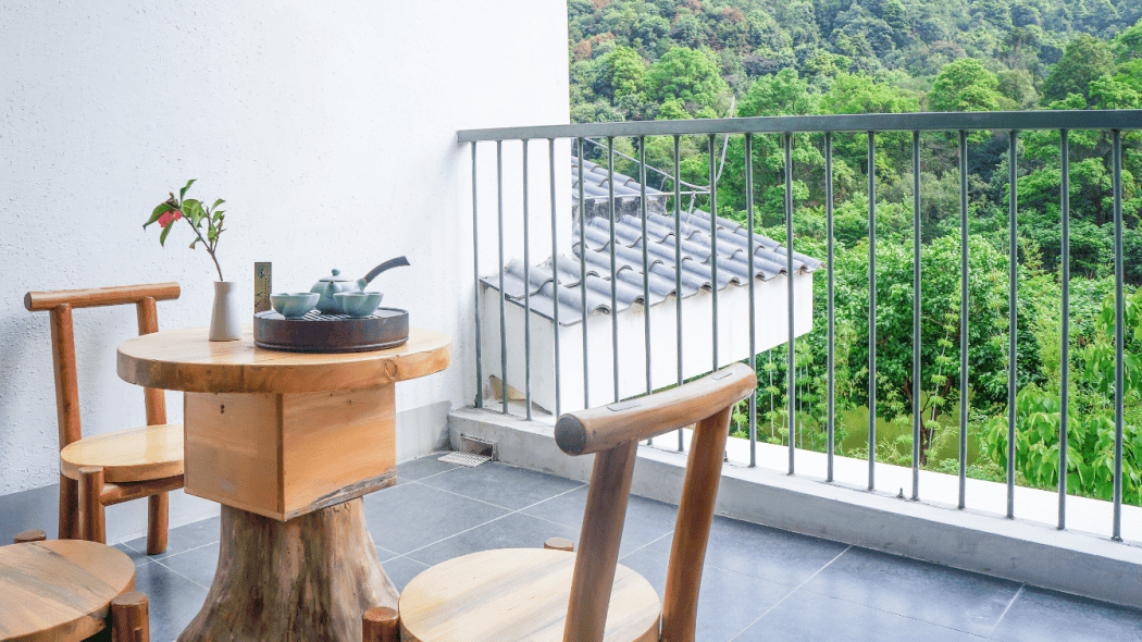 民宿虽然没带院子,却也有自己的一方小天地,相比于一楼的房间,二楼的飘窗能远眺更深的山林,床旁边的飘窗,还设置了一套小茶几,适合午后、或是夜晚在这里聊天、放松。