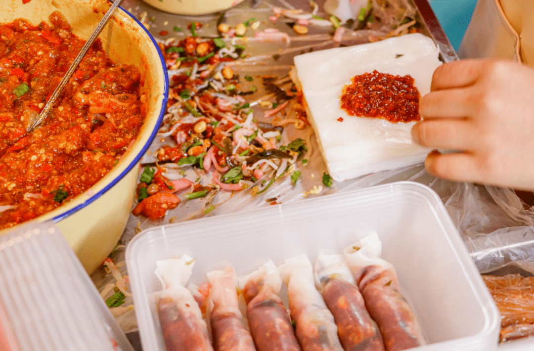 起源于90年代的裹卷,是安顺的经典小吃。米面做的卷皮,薄如蝉翼。卷上折耳根、萝卜丝、豆芽,再刷上酱料。这里的酱料有五种可以选择,鸡辣椒、青辣椒、油豆豉、肉末豆腐干和香菇肉末。不管哪一种,入口都香得不得了,爽口不腻。