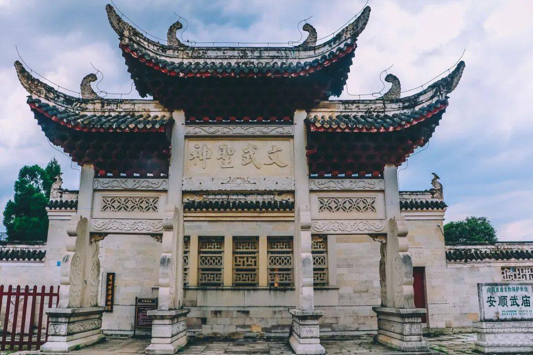 安顺武庙始建于明洪武十五年,至今已600多年。修建后的武庙,是一组中轴对称布局严谨的古建筑群,该庙整体布局呈长方形,为石墙围护三进四合院式石木结构建筑群。