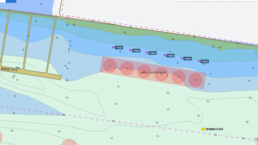 位置:通海码头下游水域至新江海河口之间,长约1200米,宽约180米