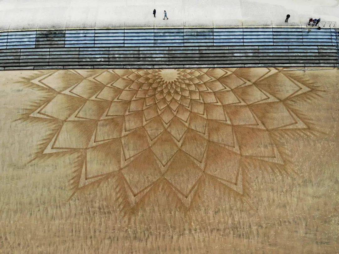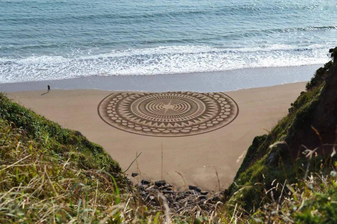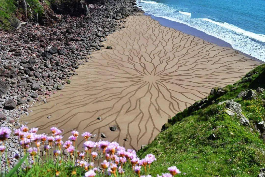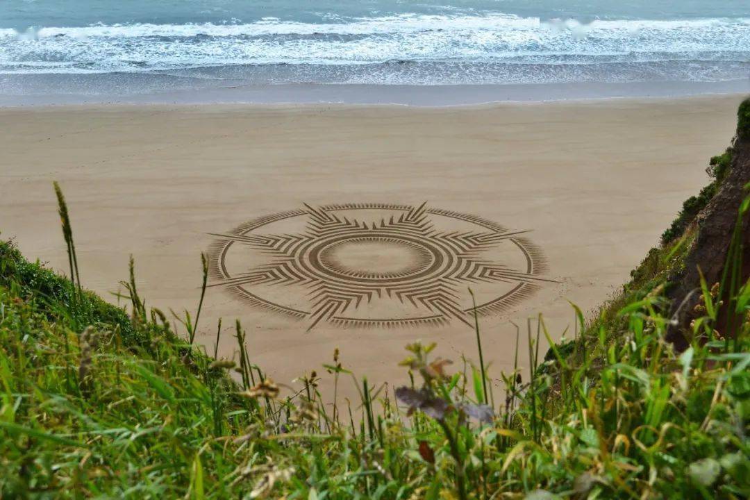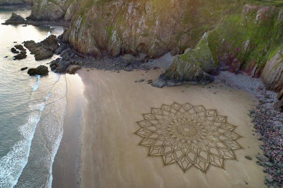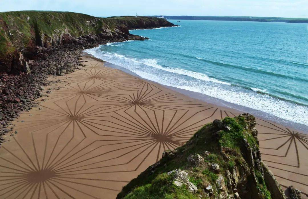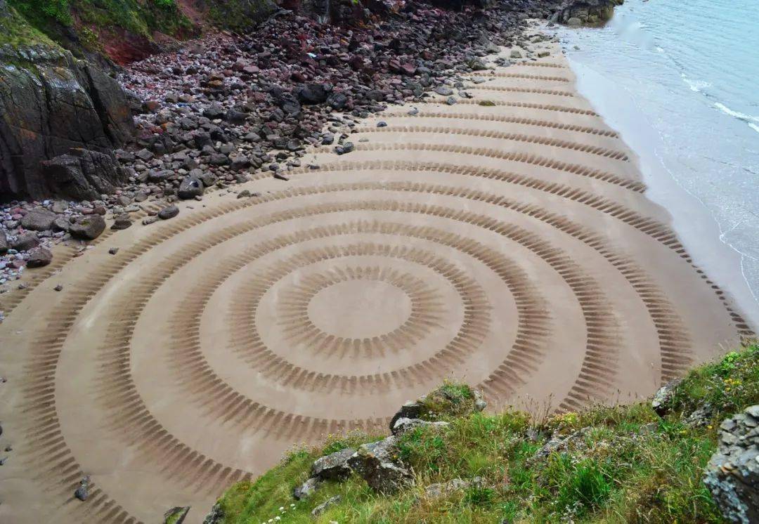 当他不使用现成的物品时,福尔曼只是在沙地上画画,他站在可以俯瞰海岸的悬崖上,从高处拍摄展示他史诗般的创作,从有图案的圆形设计到几何线条,每一幅壮观的沙画看起来都像一个另类的麦田怪圈。