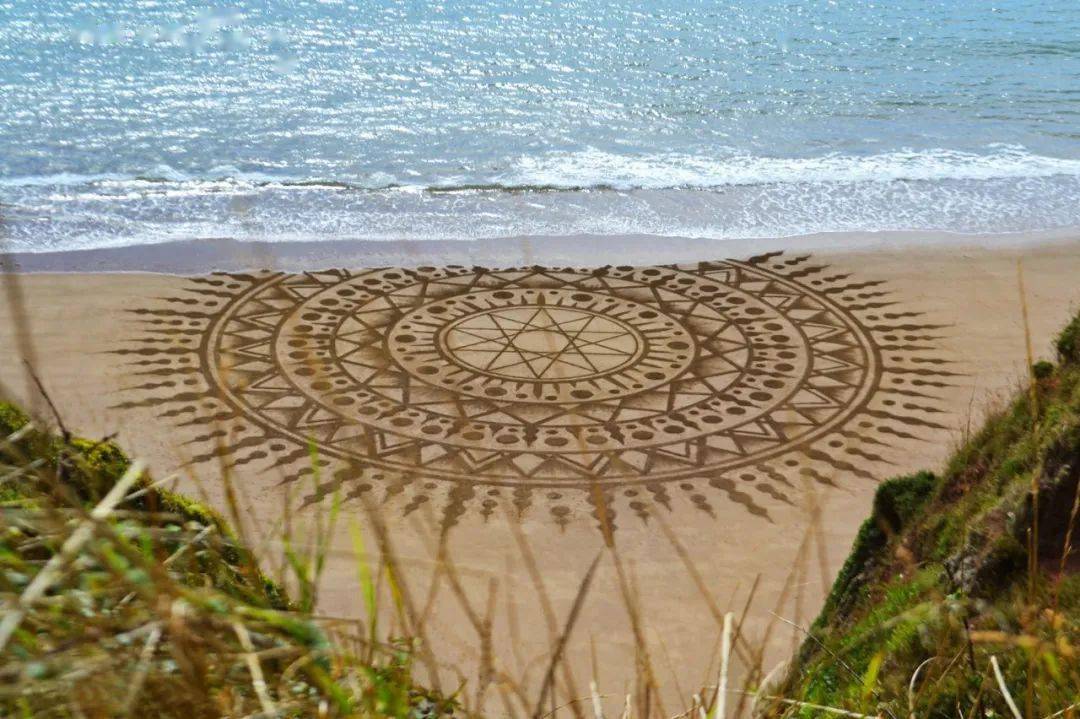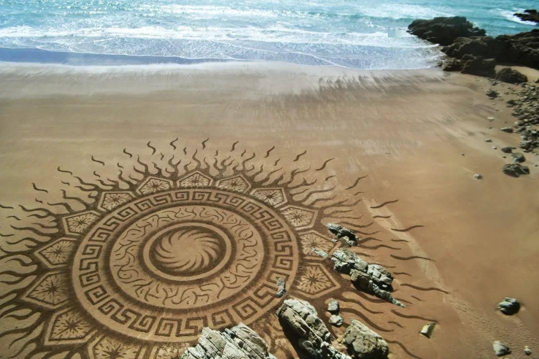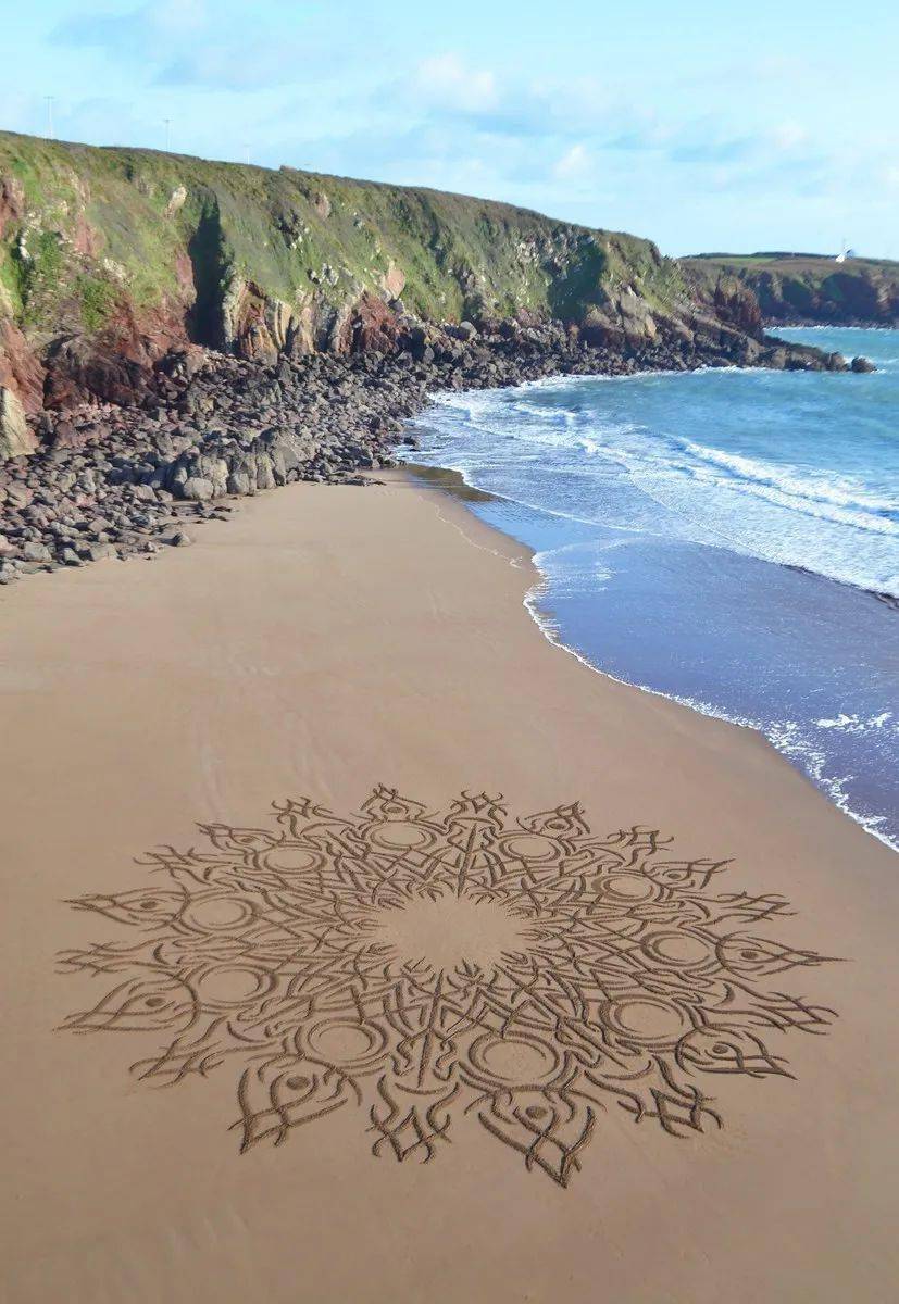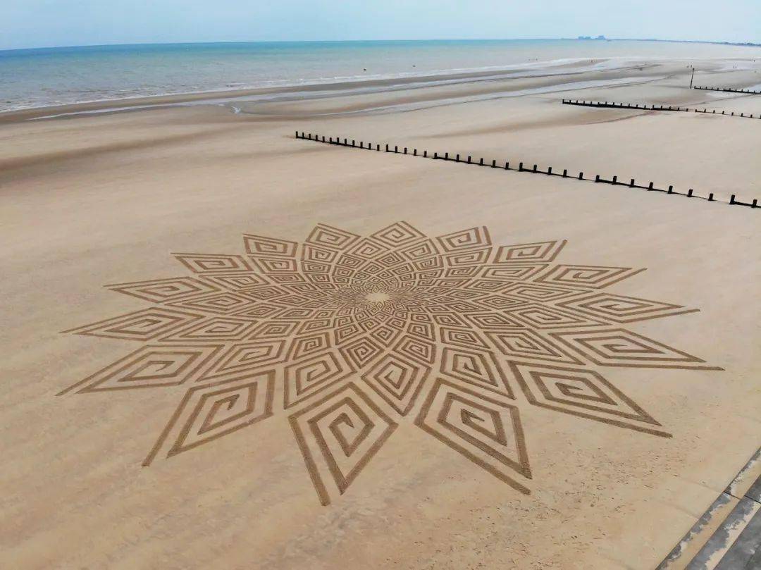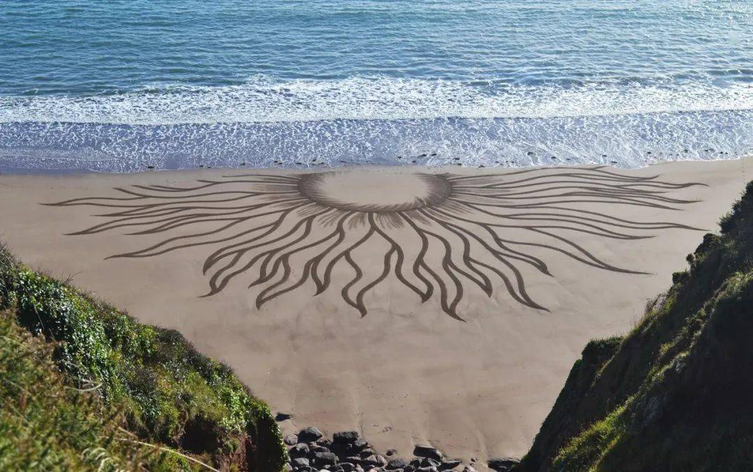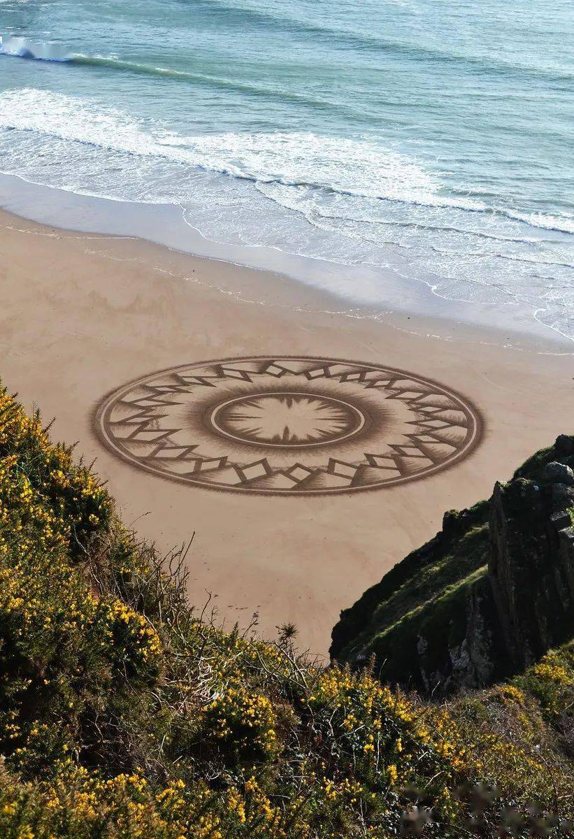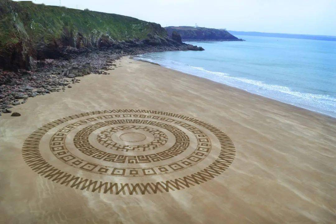 当他不使用现成的物品时,福尔曼只是在沙地上画画,他站在可以俯瞰海岸的悬崖上,从高处拍摄展示他史诗般的创作,从有图案的圆形设计到几何线条,每一幅壮观的沙画看起来都像一个另类的麦田怪圈。