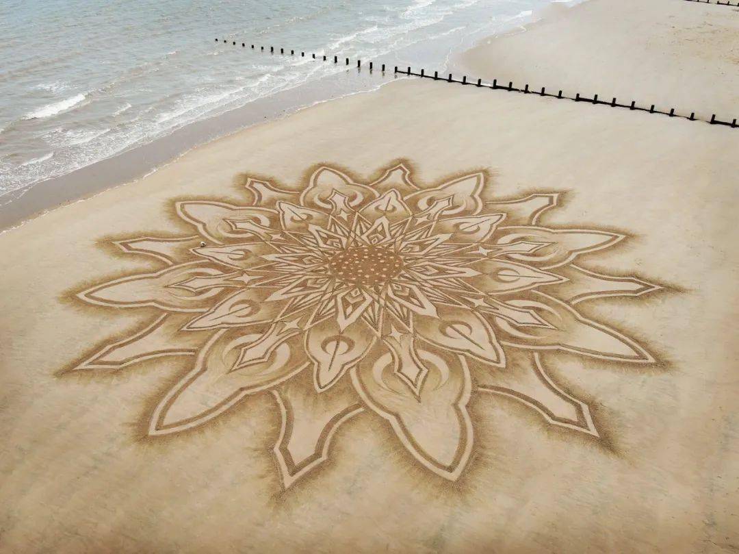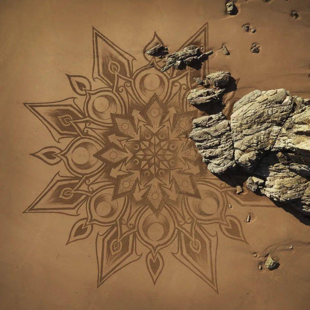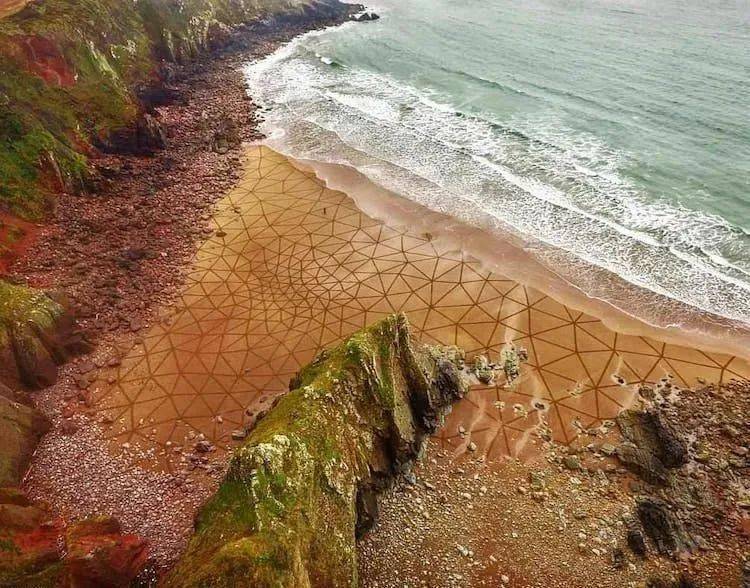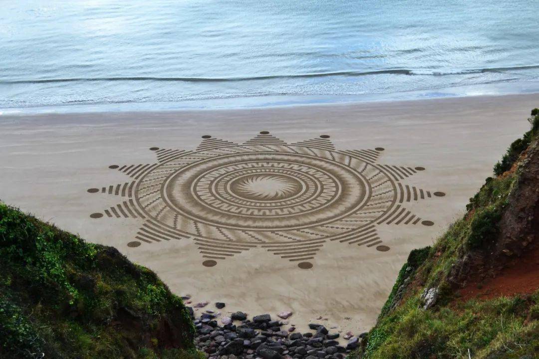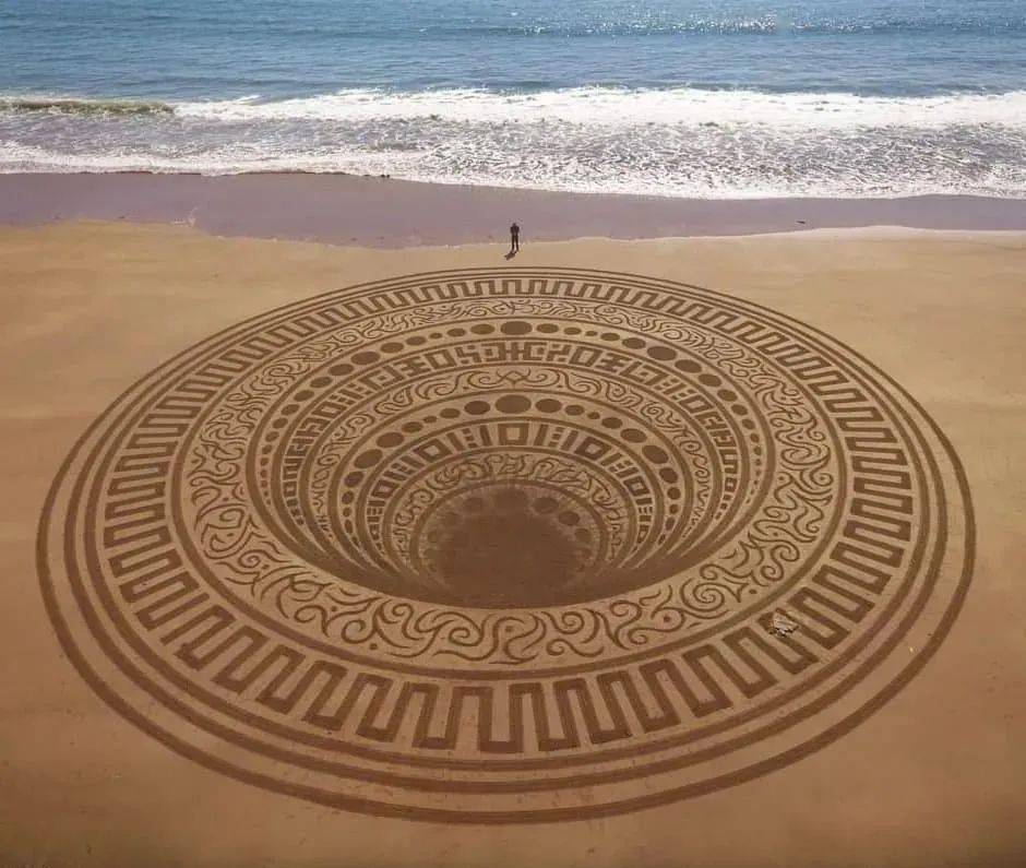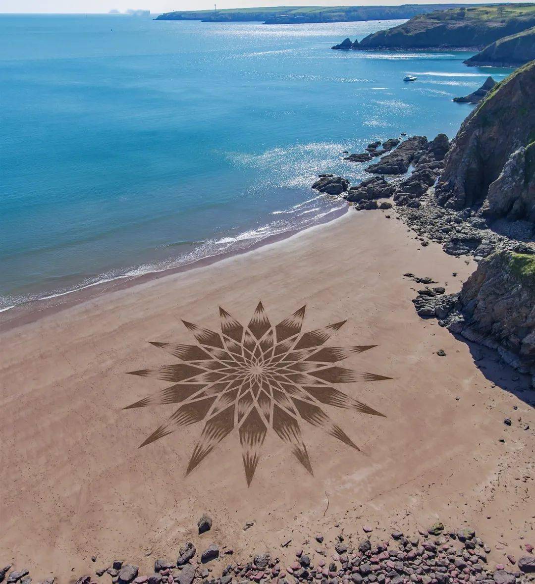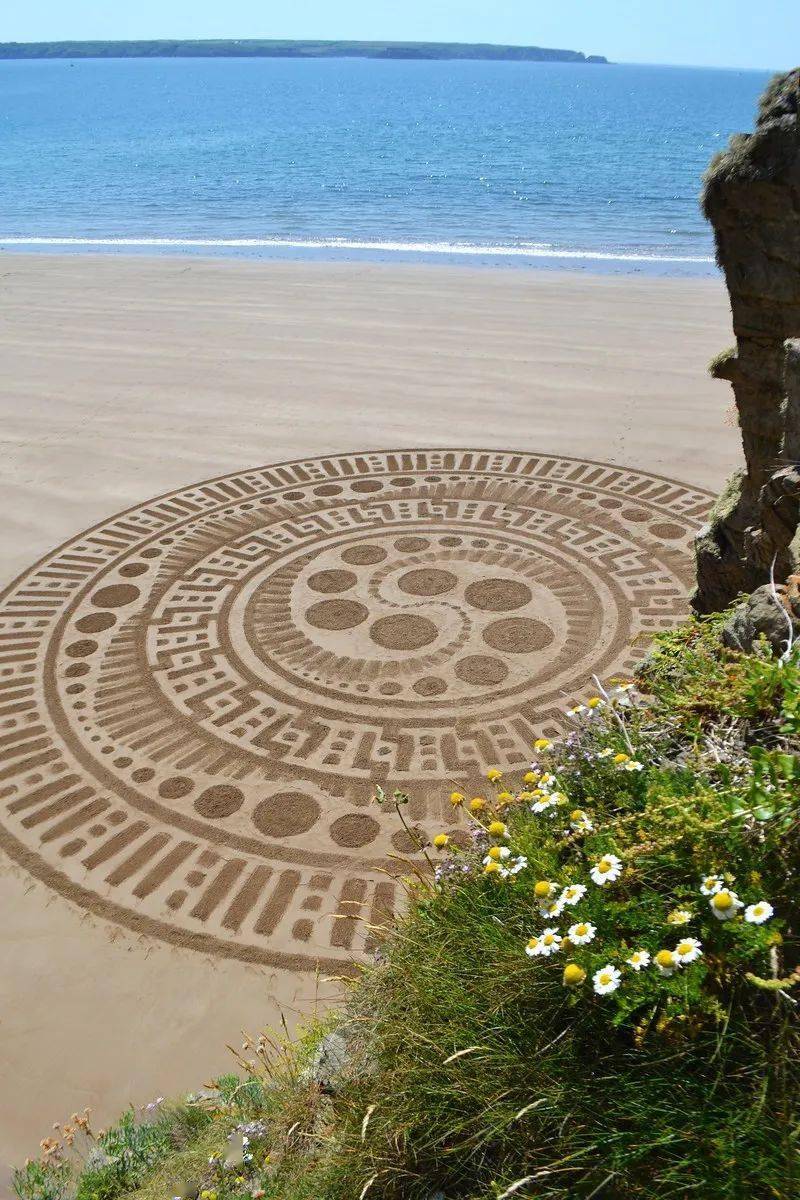 当他不使用现成的物品时,福尔曼只是在沙地上画画,他站在可以俯瞰海岸的悬崖上,从高处拍摄展示他史诗般的创作,从有图案的圆形设计到几何线条,每一幅壮观的沙画看起来都像一个另类的麦田怪圈。