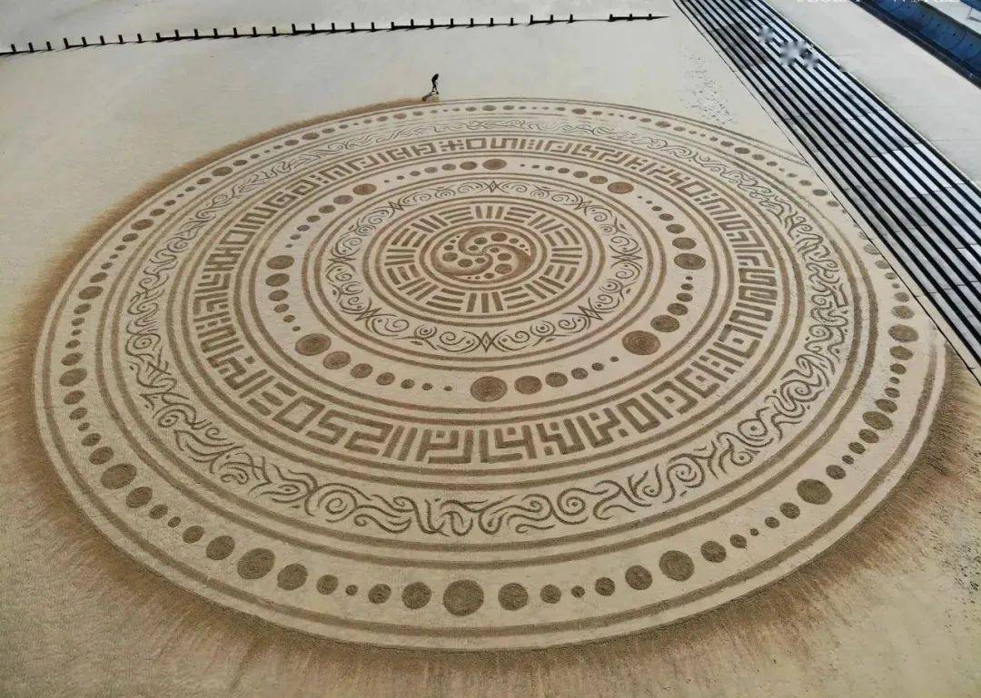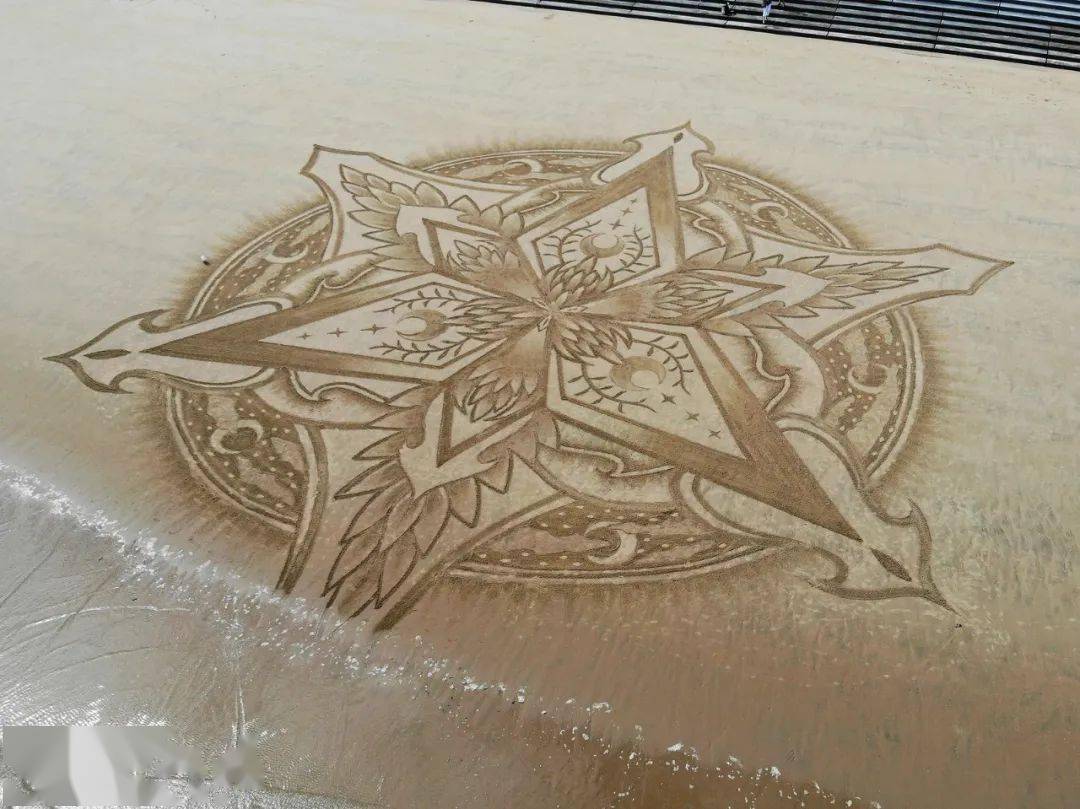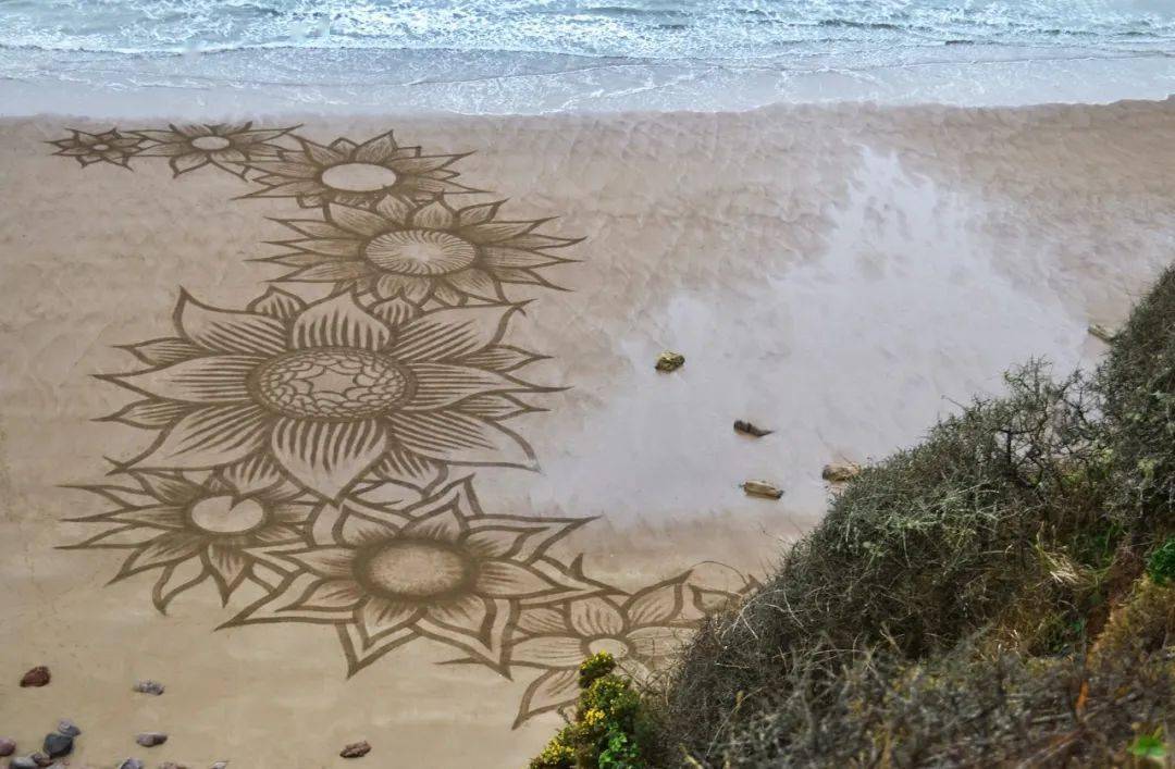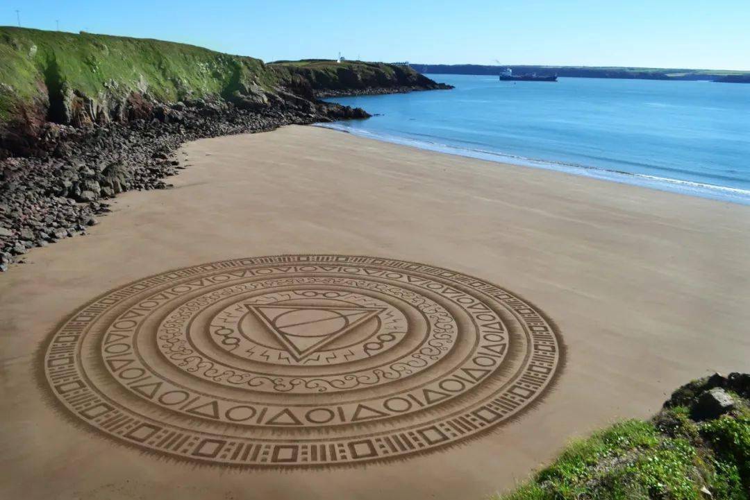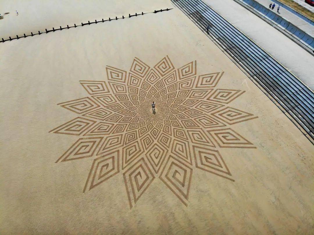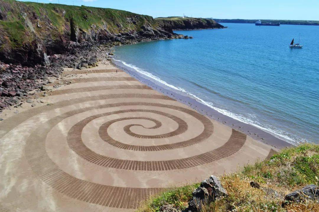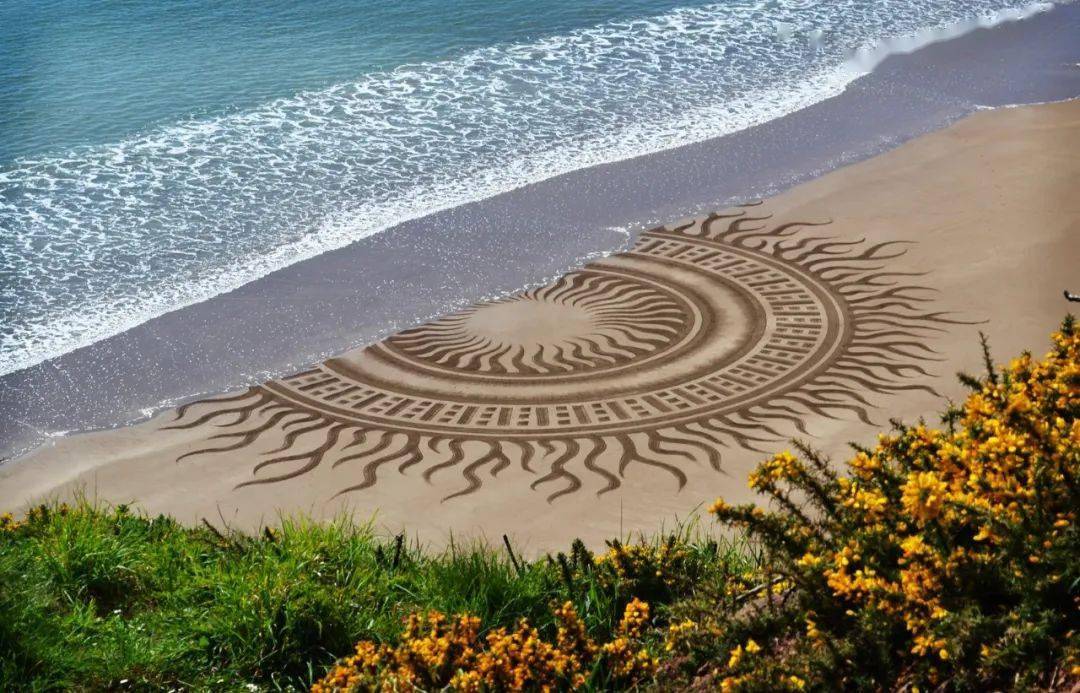 当他不使用现成的物品时,福尔曼只是在沙地上画画,他站在可以俯瞰海岸的悬崖上,从高处拍摄展示他史诗般的创作,从有图案的圆形设计到几何线条,每一幅壮观的沙画看起来都像一个另类的麦田怪圈。