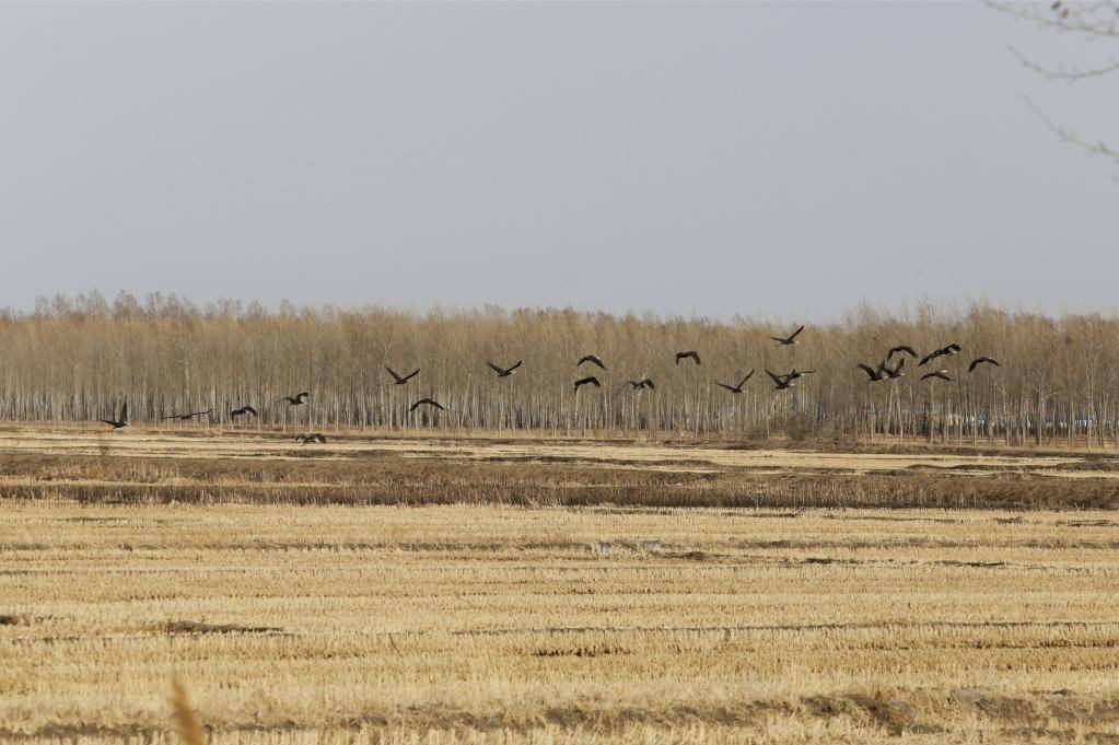 天空中,一群群鹤陆续出现,有的落在附近的田里,有的又向远方飞去。“这一会儿工夫估计能看到100多只鹤了。”吴志林说,近几年他感觉林甸的鹤更多了,“有的时候几百只鹤飞过来,场面相当壮观”。