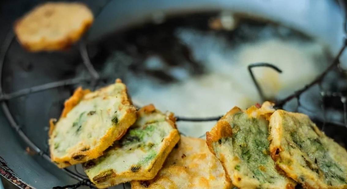 六角糕,做工讲究、精细,用包菜、萝卜、花生等丰富食材,勾芡上面粉,放到油锅中炸出来的。因为模具有六个角,所以炸好后称为六角糕。