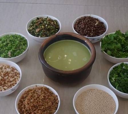 揭西擂茶是广东揭阳揭西一带的传统名点,其制作并不复杂,主料是大米或炒米,但配料复杂。先把花生、芝麻、茶叶、金不换或者苦辣芯,放在擂钵里,用擂茶棍擂成糊糊,冲上开水,然后在砂锅里炒些萝卜干、甘蓝菜、大葱、青葱、黄豆、树菜等等,或者再配些瘦肉丝、虾仁米、鱿鱼等,最后混合炊熟的白米饭。这样的擂茶吃起来甜、酸、辣、苦、咸五味俱有,大开胃口,饶有风味。