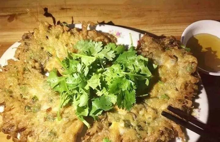揭西传统民间小食,又名“蚝煎”,用旺火烧热平鼎,加入少许猪油将蚝和粉水混和成浆状后下鼎,再把鸭蛋打散淋在上面,加入猪油煎,配入辣椒酱调味,煎至两面酥脆呈金黄色,伴上芫荽,吃的时候蘸上沙茶酱和鱼露,味道好极了!