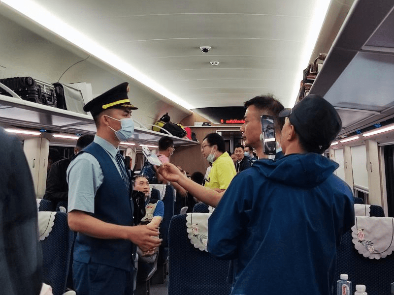 到了西双版纳站之后,列车员开始发离境卡、统计没有签证的旅客人数。由于老挝磨丁的铁路口岸没有落地签服务,乘坐首发列车的旅客需要提前办理签证,但是关于签证的通知是在首发车票开票大半天之后才通知的,此时距离列车发车只有一个工作日。