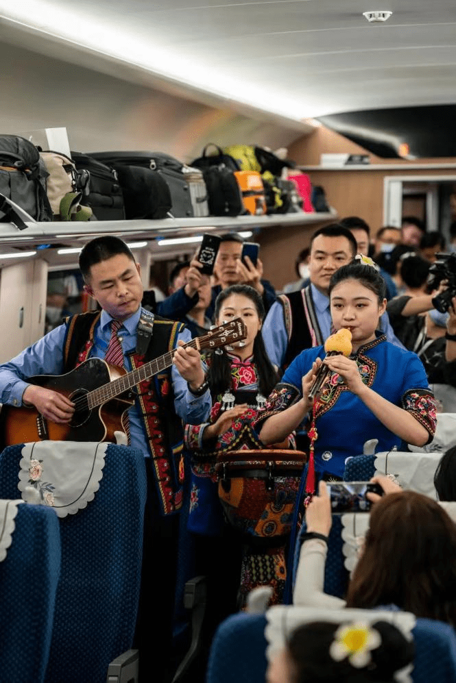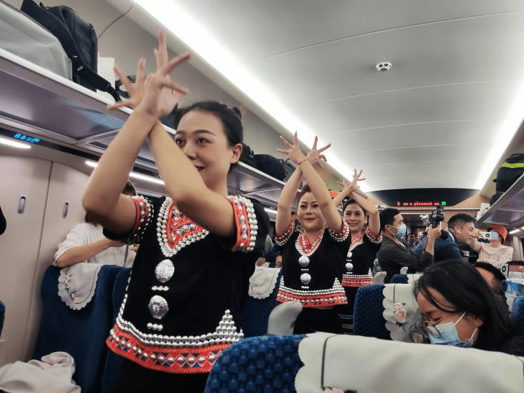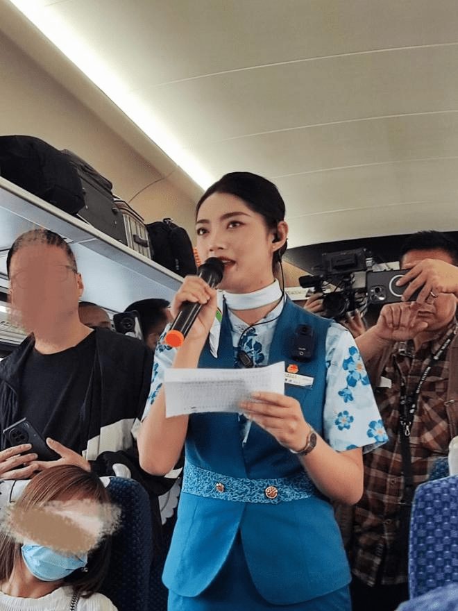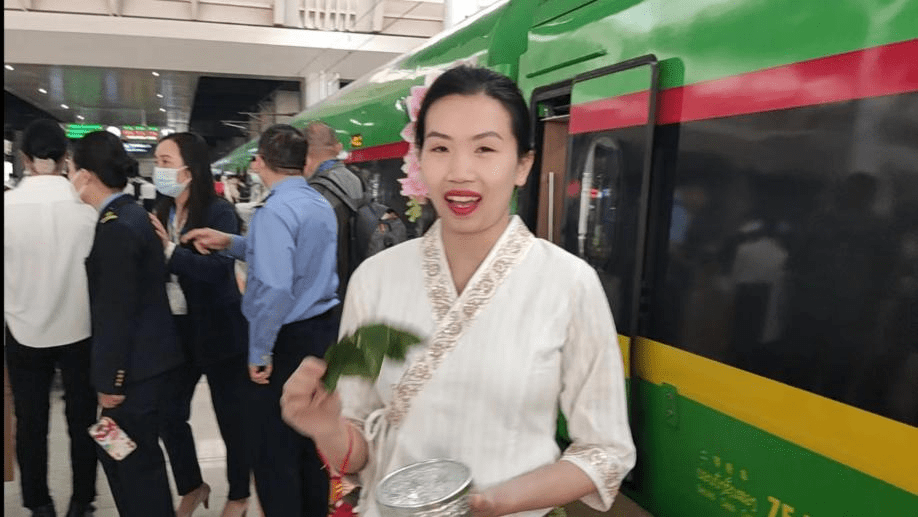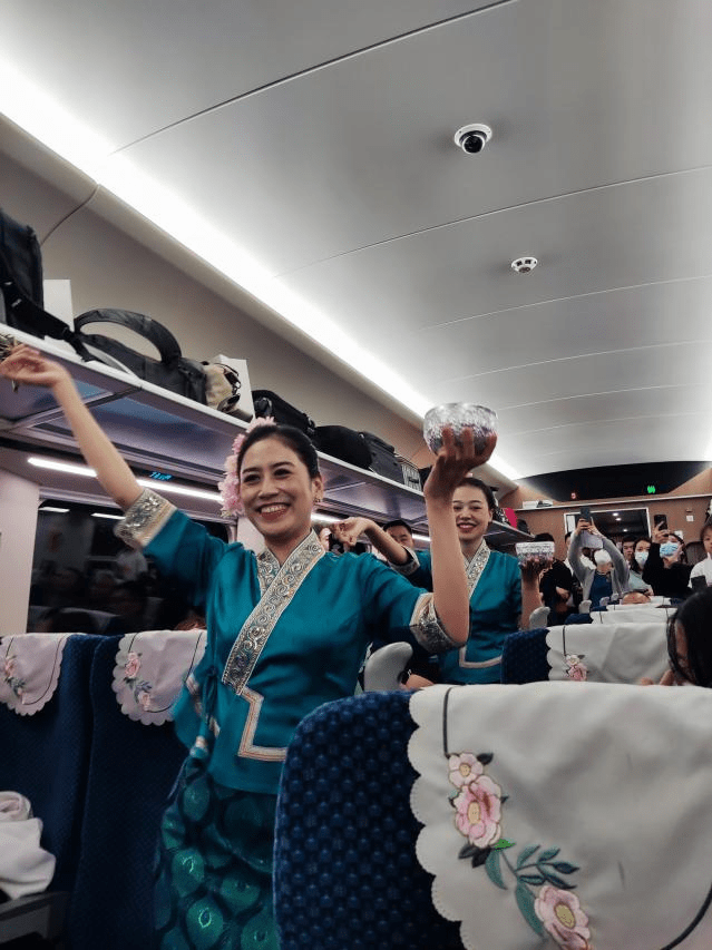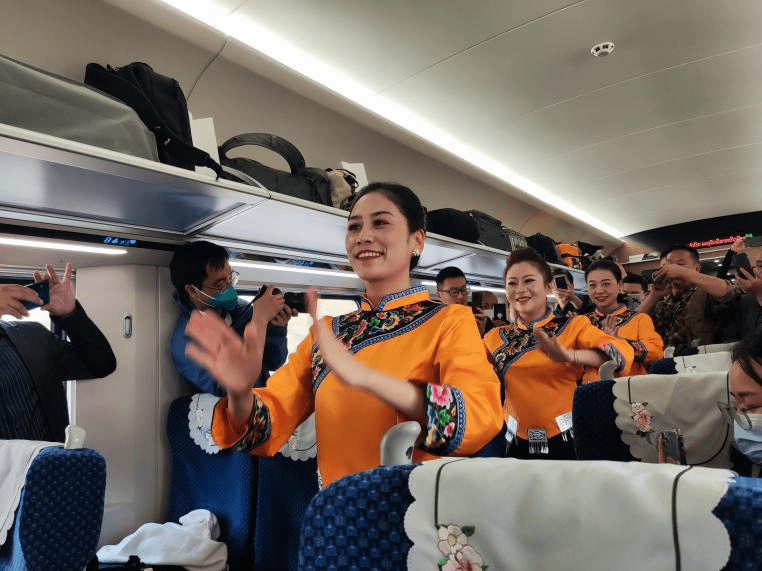 部分媒体记者发车后继续跟车,一直跟访到入境老挝。上车后意外发现5车厢聚集了很多“长枪短炮”,原来本节车厢有中方列车工作人员准备的欢迎节目。