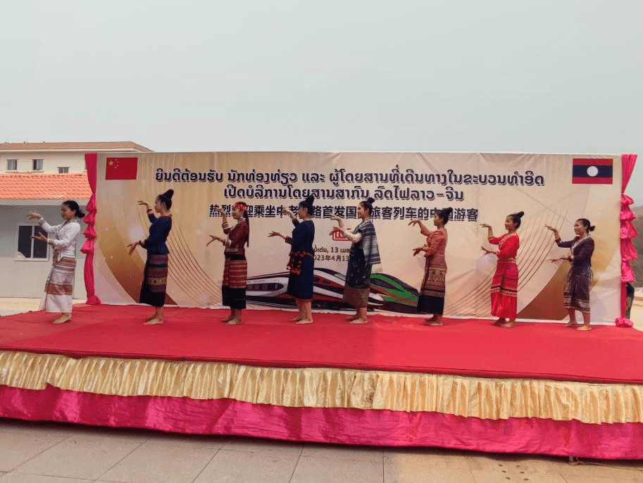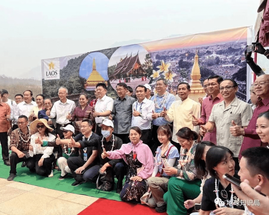 磨丁的气温相比云南着实有些炎热,热浪蛰伏在空气中,远处的山体裸露着赤黄土色,灰尘仿佛在空气中做布朗运动。在临时搭好的棚子下面落座后,捡起座位上的水开始吨吨吨,欣赏了一会儿老挝舞蹈,就进入了领导讲话流程,老挝文化和旅游部部长发表了讲话,展望了一番中老入境游的前景,接着就是拍合照环节,领导们邀请乘客一起拍合照。