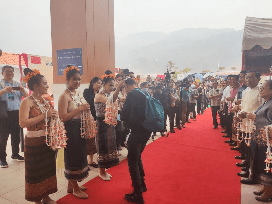 过了老挝海关核验柜台,就听到老挝音乐飘了过来,老挝文化部为了庆祝首发列车,在磨丁口岸组织了欢迎仪式。出口有两列盛装的女性工作人员依次给每位乘客戴上鸡蛋花项链,还送上“你好”“welcome”等祝福。