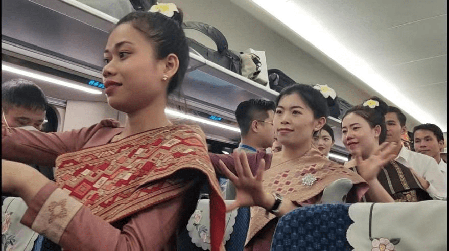 老挝海关工作人员着土黄色制服,剪裁比较贴身,有些军装的风格;安检人员则是淡蓝色polo衫和黑色制服裤子;列车工作人员则穿着老挝传统服饰,女性着筒裙装头戴占芭花(老挝国花,中国称鸡蛋花),妆容精致。传统筒裙的材质一般是棉花和纱混纺的粗布,利用树根、花瓣、种子等上色,靠近裙摆下缘是精美的纺织图案,它暗含一个人的种族、婚姻状况和所属地区等信息,一般在节日或舞蹈表演时穿着,年轻女性着鹅黄、橘黄、粉色、淡紫等,中老年女性则穿深紫、墨绿、深蓝、深咖等颜色。