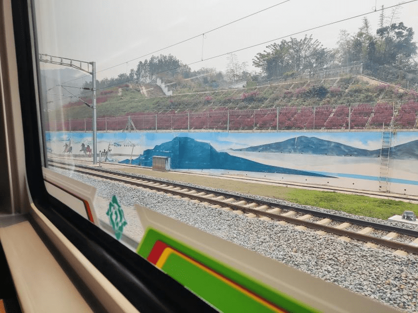 直达列车在两国海关和口岸的预留时间为3小时,非常充裕。听之前乘坐过预通车的记者说,隧道里有彩绘的壁画和中老两国的国旗,在隧道内灯光亮起后会非常好看,确实如此,可惜车厢内灯光没关,无法留下影像。