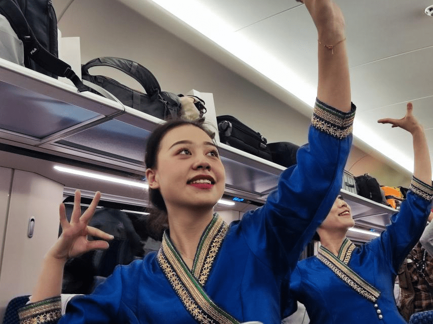 主持人是乘务员之琳(音),在她和别人的闲谈中得知她是老挝语专业毕业。不由得佩服中老铁路列车员的招聘标准,不仅要熟悉铁路列车工作,还要多才多艺会唱歌会跳舞会主持。